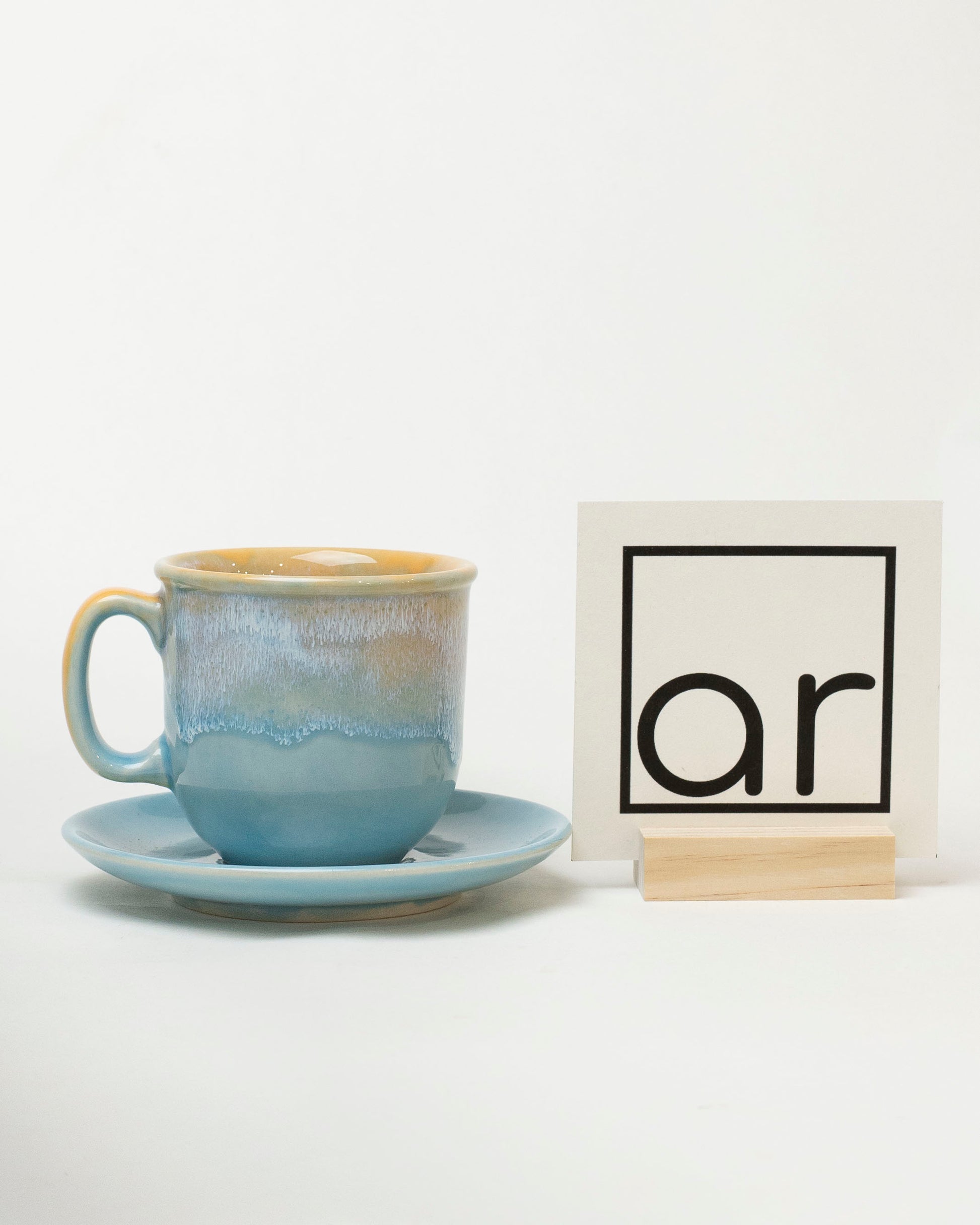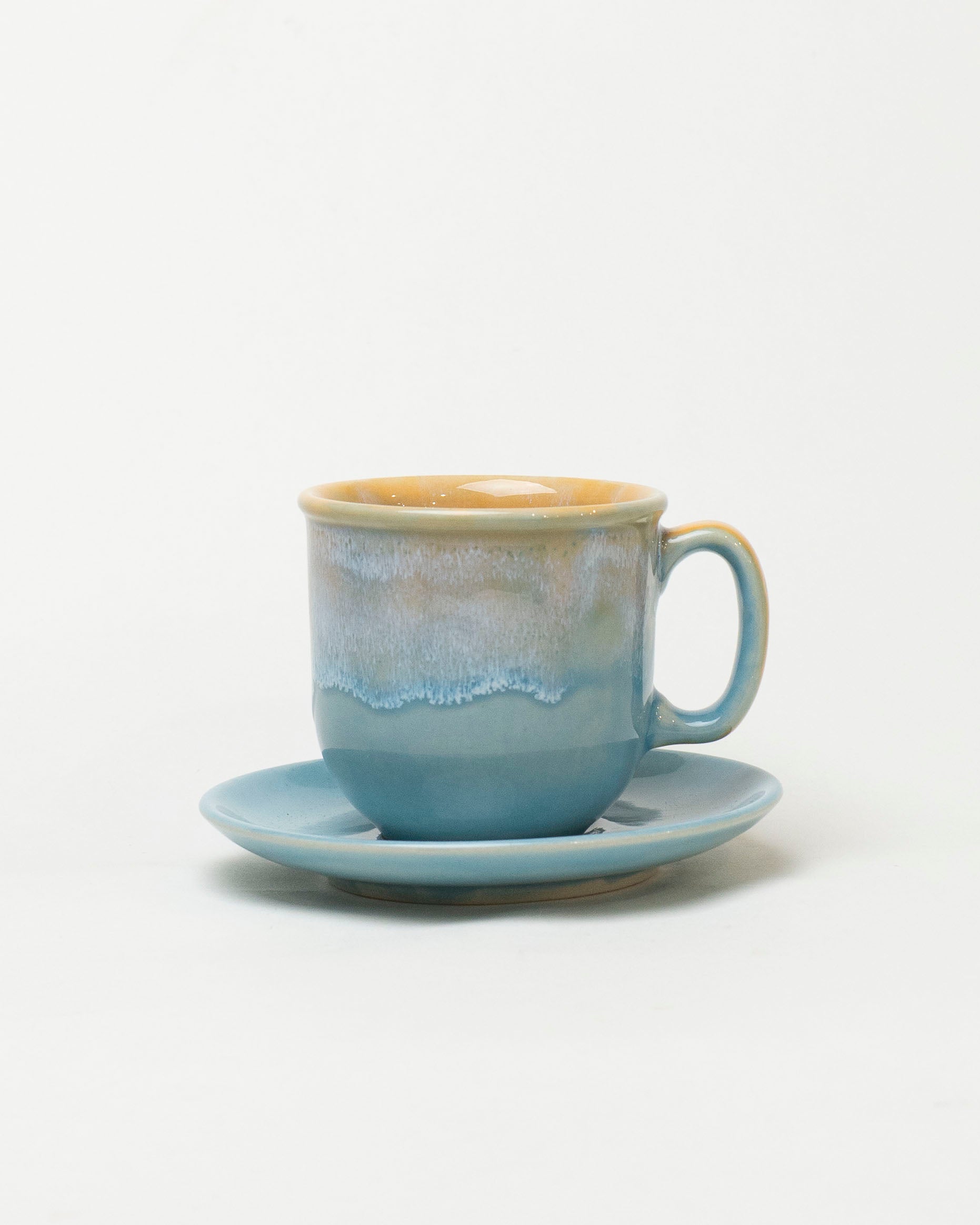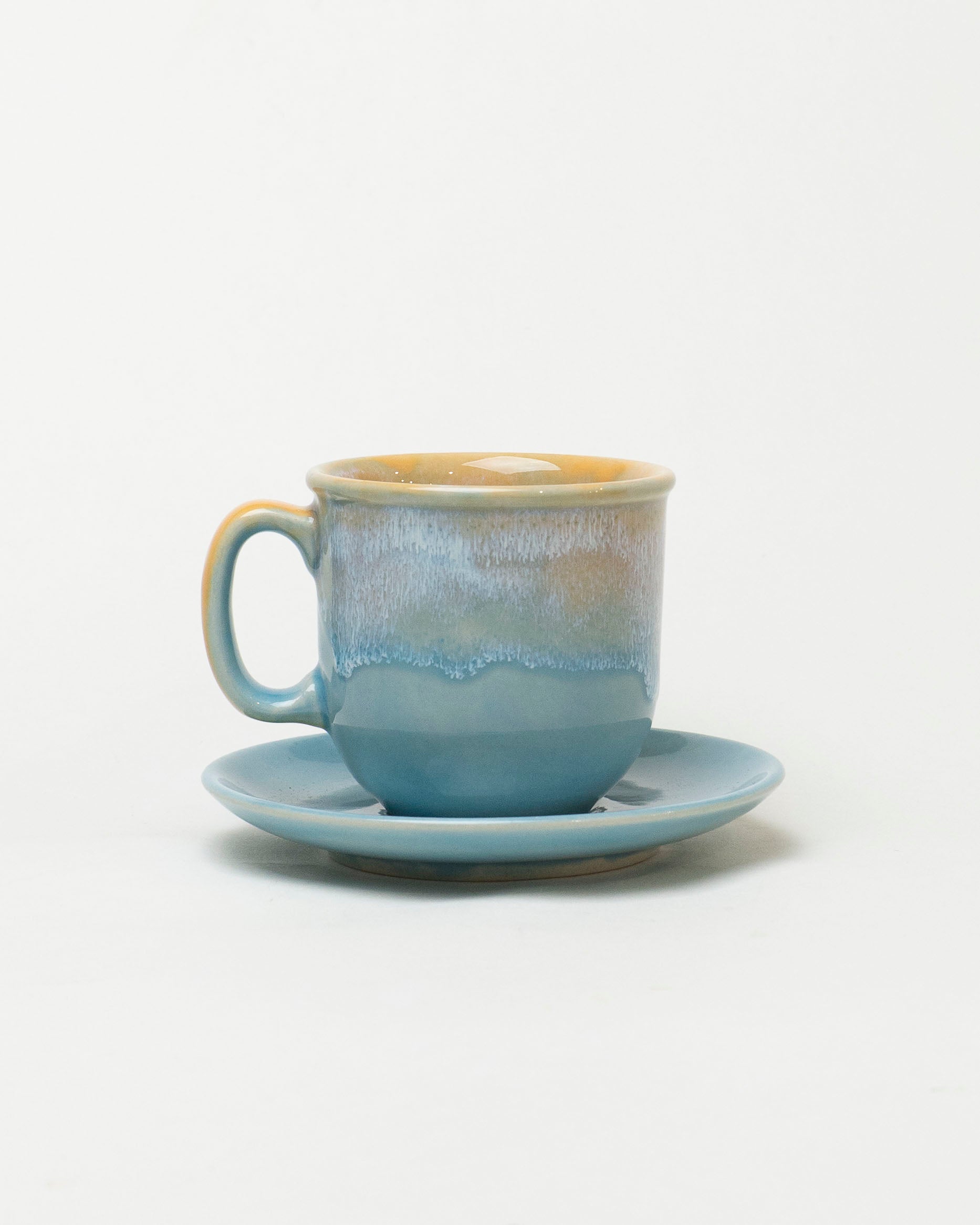 Delikatna jak wschód słońca nad wodą, gdzie złote światło spotyka się z chłodnym błękitem. Szkliwo spływa miękkimi, mlecznymi smugami, tworząc subtelny pejzaż na ceramice. Filiżanka wraz ze spodkiem zaprasza do rytuałów – tych codziennych i tych, które celebrujemy od święta.
