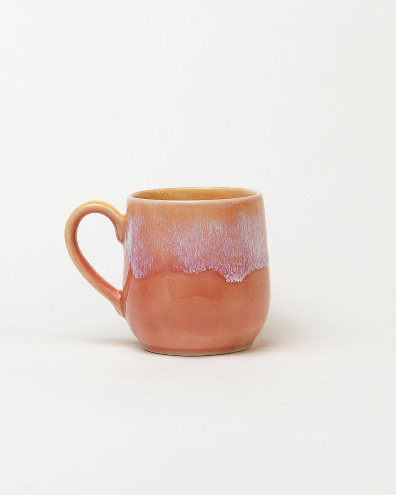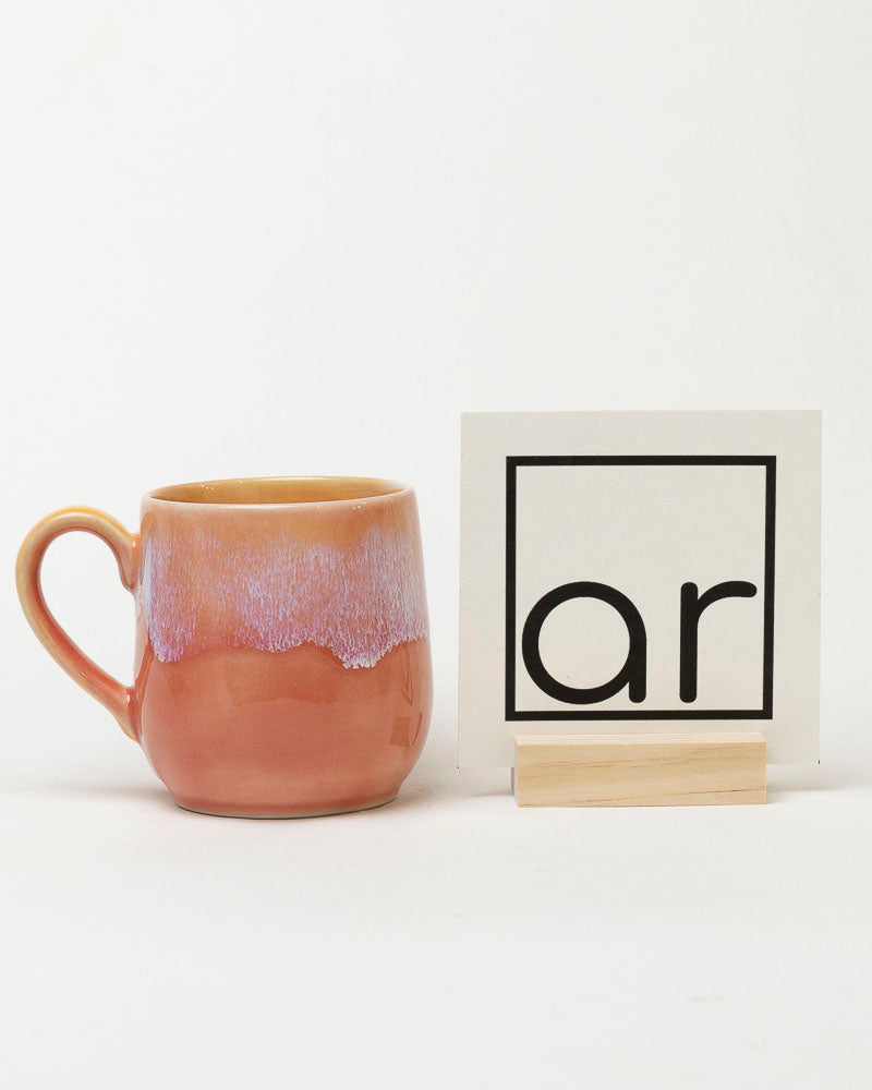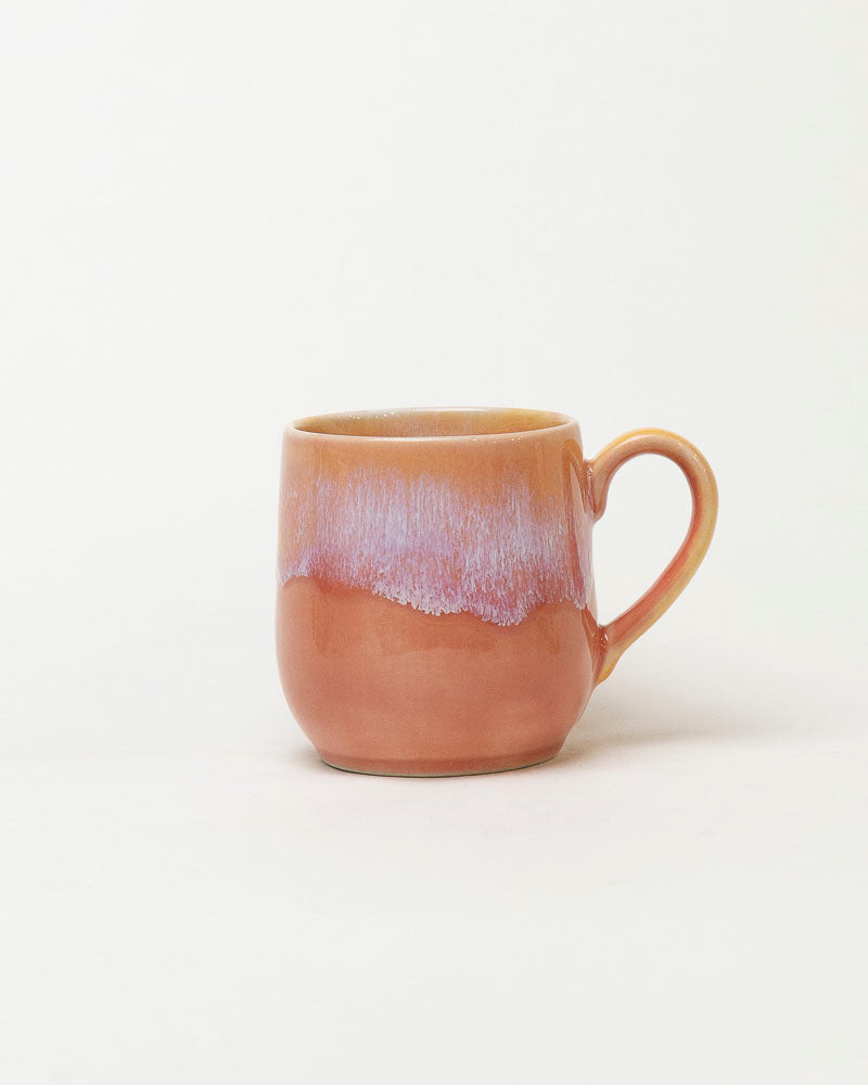 Jak ciepły podmuch lata — miękkie przejścia różu, moreli i delikatnej lawendy układają się w subtelny, świetlisty gradient przypominający niebo tuż przed zachodem słońca. W dotyku gładki, wizualnie kojący, a dzięki ręcznemu szkliwieniu każdy kubek nosi własny, niepowtarzalny układ barw.