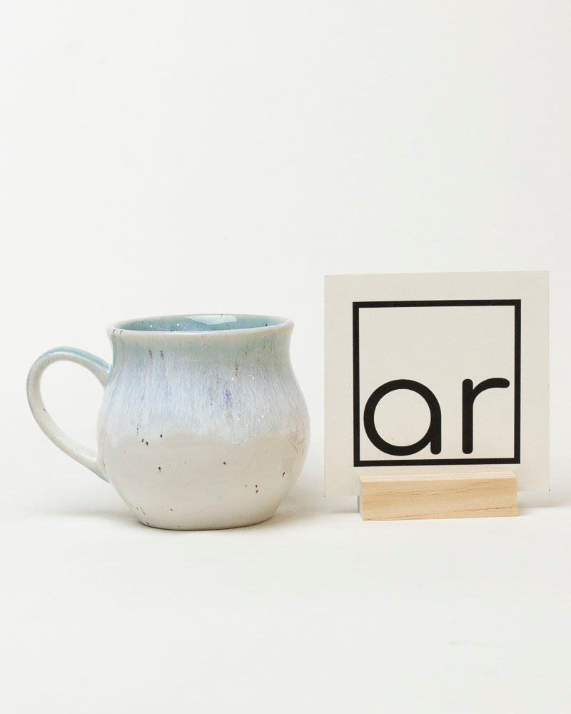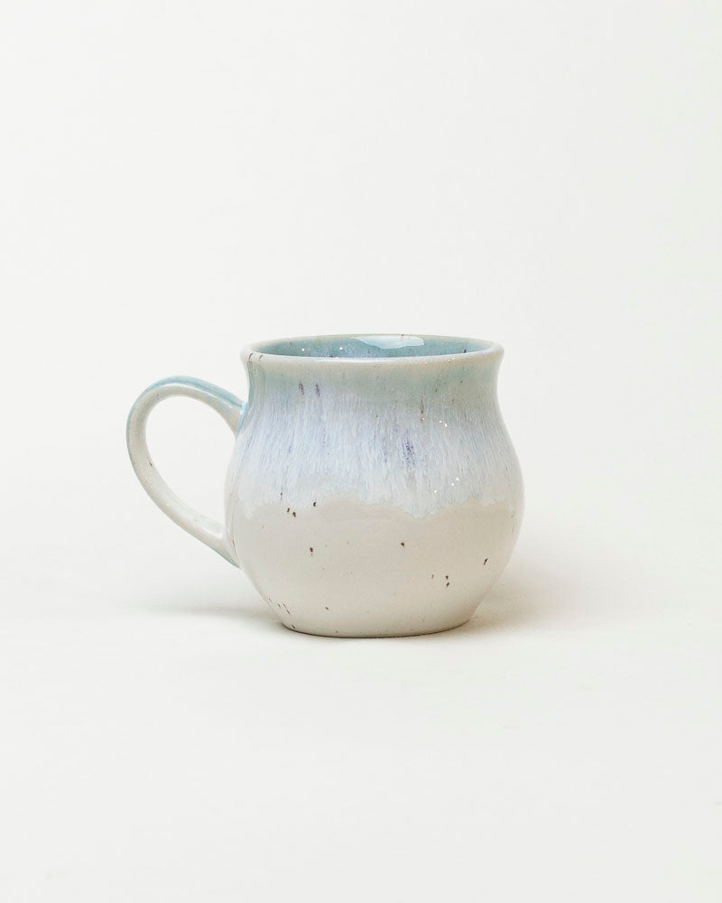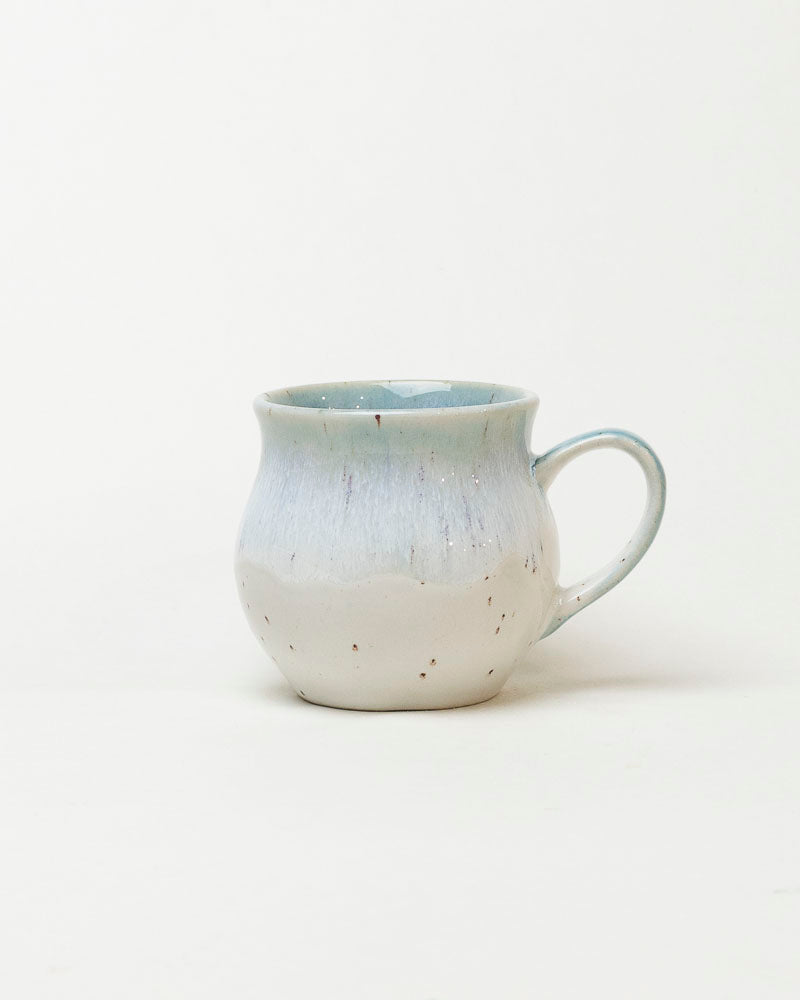 Pastelowa biel przechodząca w delikatny, chłodny błękit tworzy na powierzchni kubka miękką, spokojną aurę porannej mgły. Subtelne nakrapianie dodaje mu naturalnego charakteru, a zaokrąglona, pękata forma sprawia, że wyjątkowo przyjemnie trzyma się go w dłoniach. Ręczne szkliwienie nadaje każdemu egzemplarzowi indywidualny rytm barw.