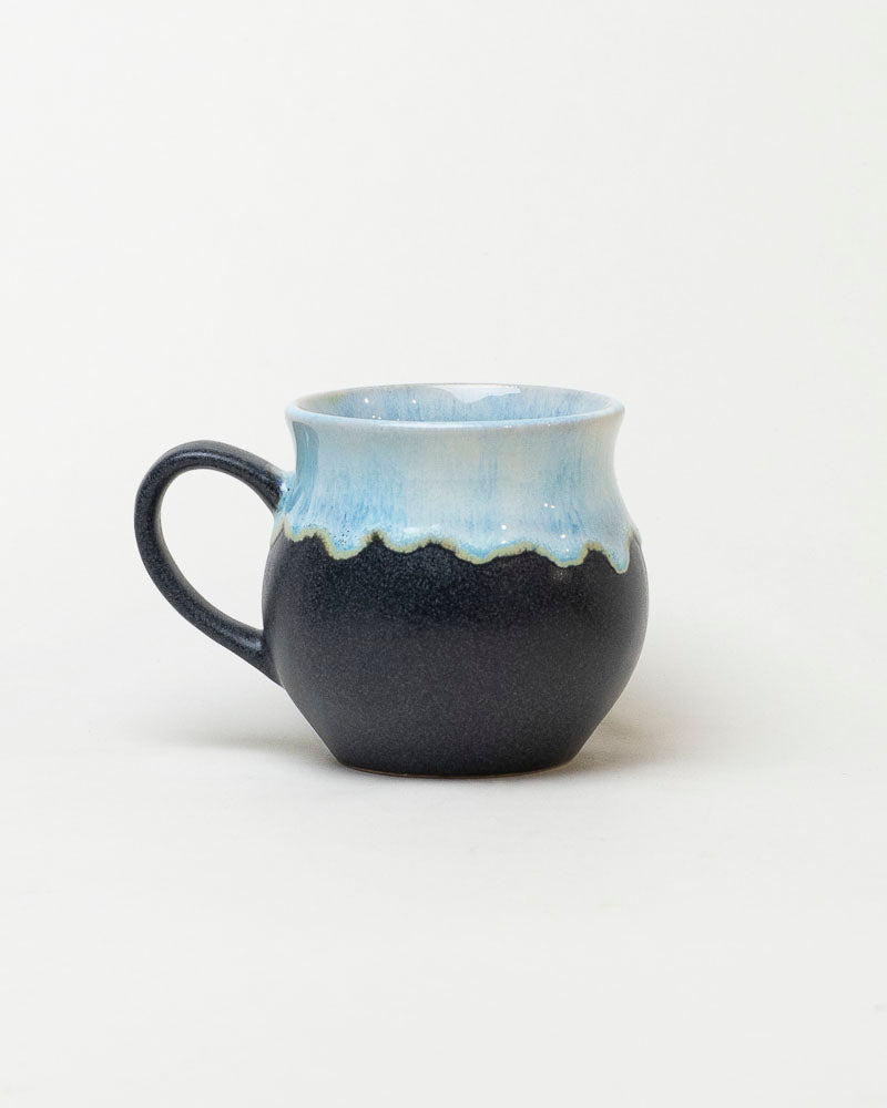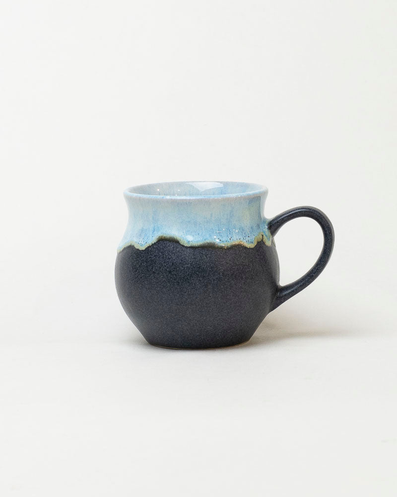 Głęboki, matowy granat przechodzi tu w chłodny błękit niczym linia gór o świcie. Ręczne szkliwienie tworzy subtelne, falujące przejścia kolorów, przez co każdy kubek jest jedyny w swoim rodzaju. Miękka, zaokrąglona forma przyjemnie leży w dłoniach, zapraszając do spokojnej przerwy na ulubiony napój.