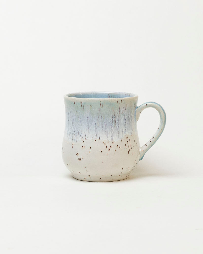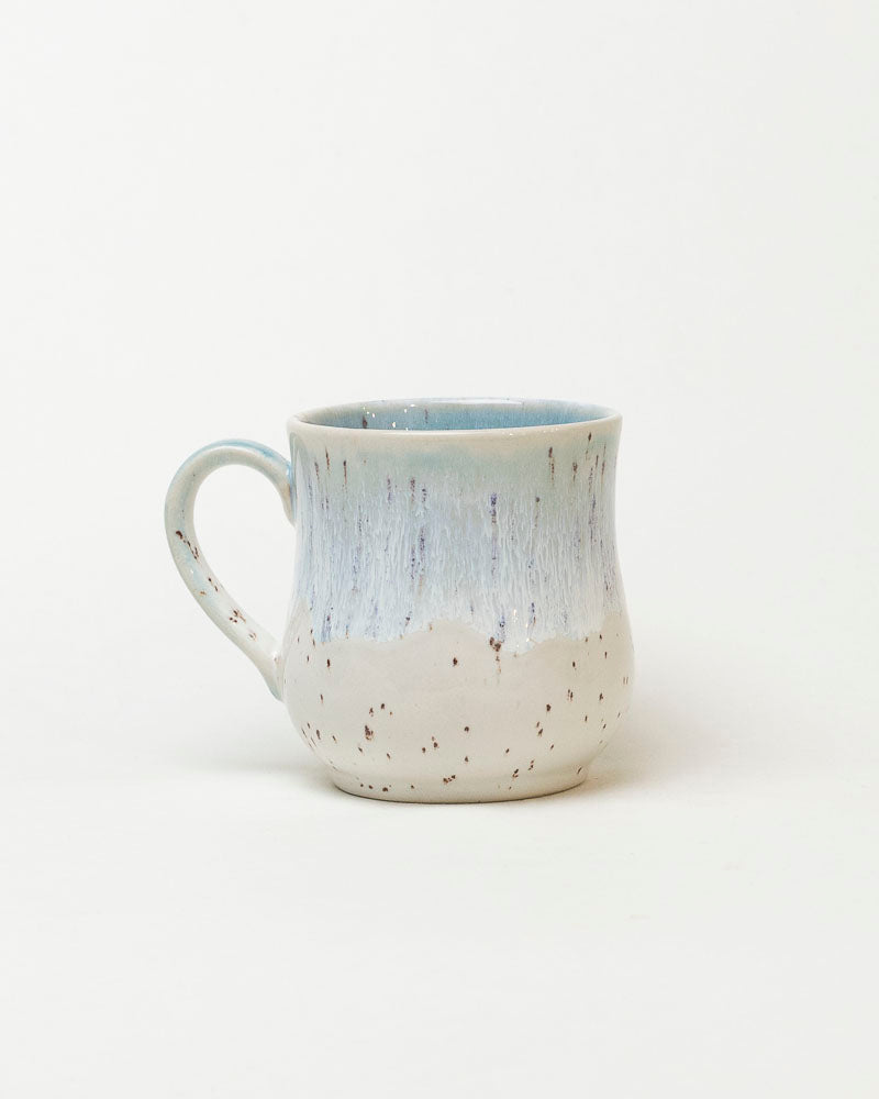 Delikatne, zimne pasmo błękitu spływa po jasnej, piegowatej powierzchni jak poranna mgła osiadająca na śniegu. Ręczne szkliwienie tworzy subtelne przejścia barw i lekkie, naturalne kropki, które sprawiają, że każdy kubek jest jedyny w swoim rodzaju. Kształt miękko zaokrąglony, wygodny w dłoni i idealny na spokojne, codzienne rytuały.