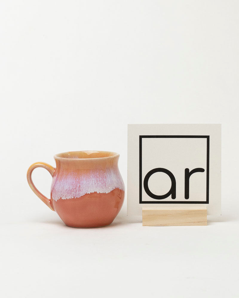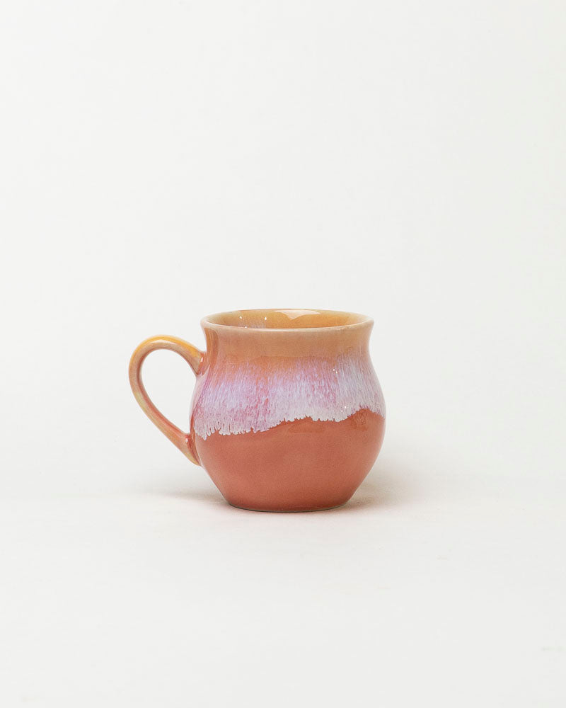 Ciepły, morelowo-brzoskwiniowy odcień spotyka się tu z jasnym, perłowym szkliwem, które spływa miękko po ściankach jak poranna mgiełka. Ręczne szkliwienie tworzy subtelne, jedwabiste przejścia kolorów, dzięki którym każdy egzemplarz ma własny, niepowtarzalny rytm. Delikatnie zaokrąglona forma sprawia, że kubek wygodnie układa się w dłoni — idealny na krótką chwilę rozgrzewającego spokoju.