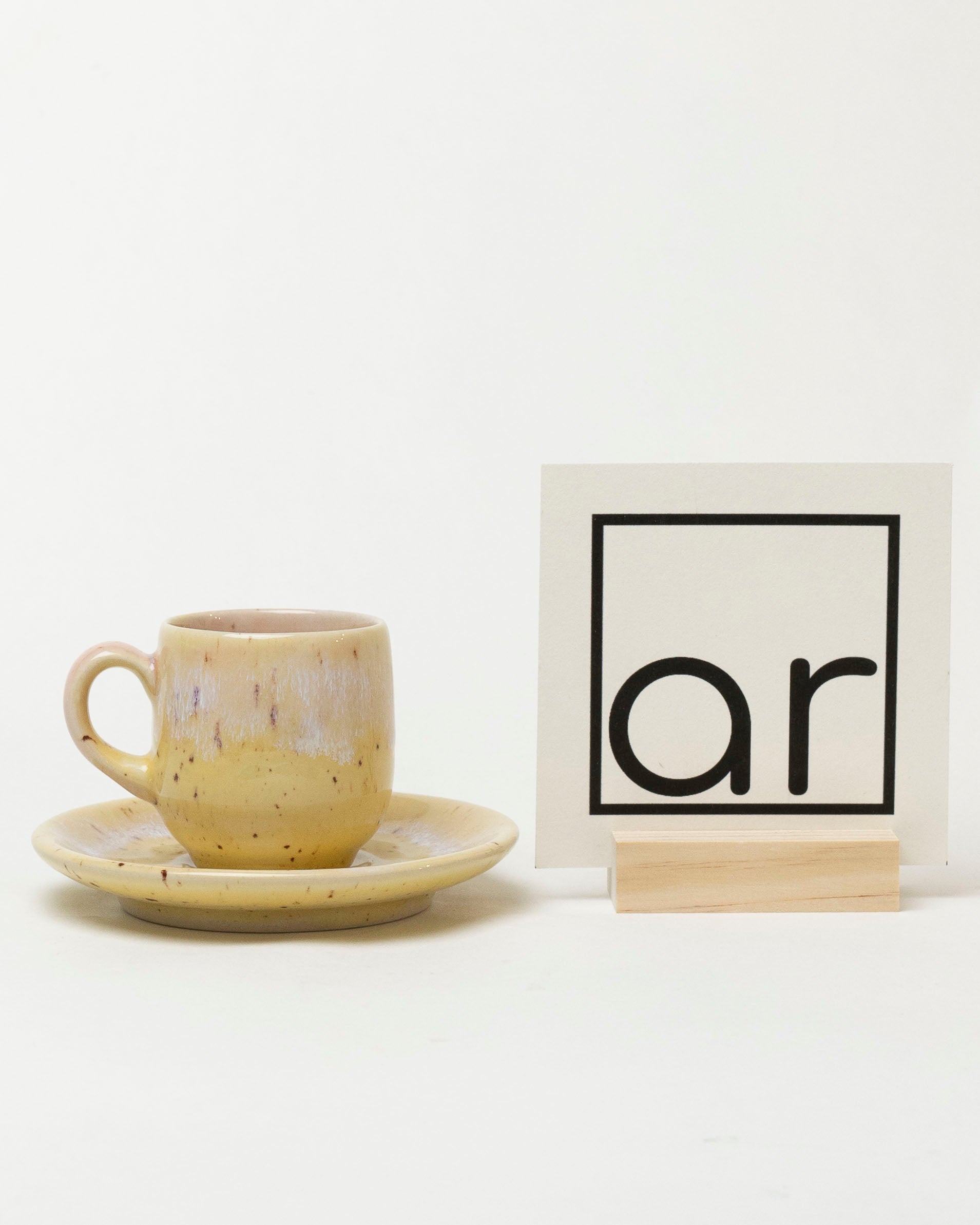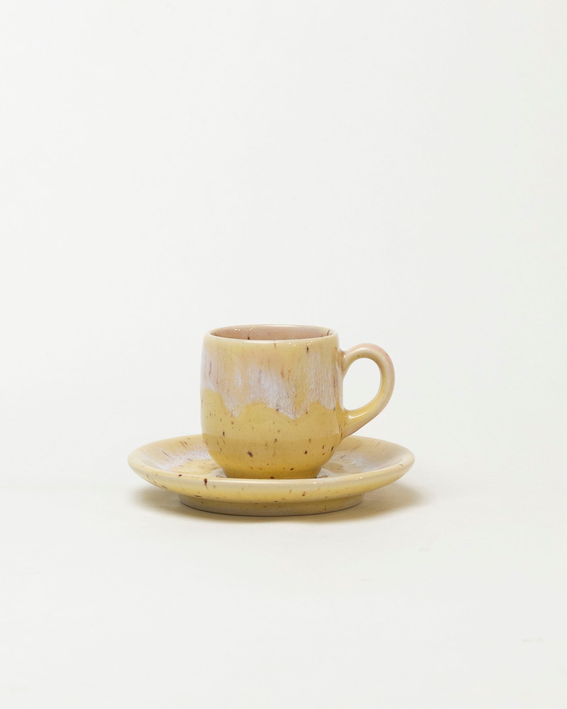 Ta maleńka filiżanka jak promień porannego światła — ciepła, żółta, z delikatnym, białawym szkliwnym opadem, który wygląda jak mgiełka unosząca się nad świeżo mieloną kawą. Jej kształt mieści w sobie esencję aromatu, a spodek tworzy spokojną, harmonijną całość. Idealna na te kilka najważniejszych łyków dnia.