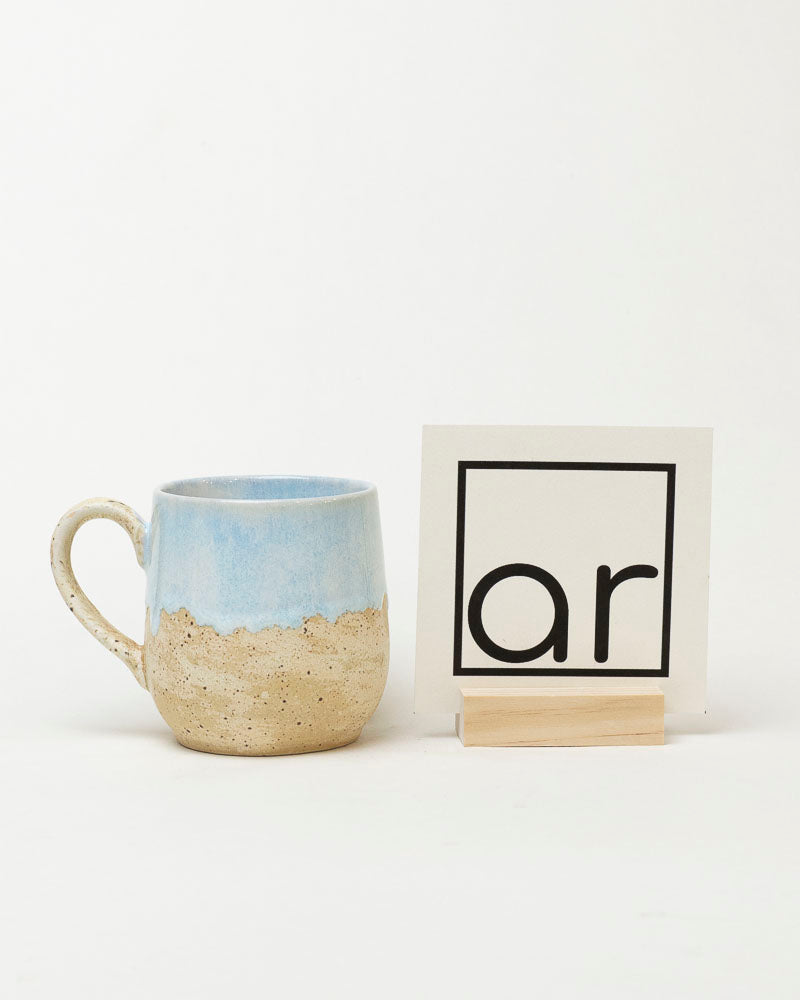 Kubek, w którym spotykają się miękkie błękity nieba i ciepła, ziarnista faktura piasku — jak spacer po plaży o poranku. Delikatne przejścia szkliw przypominają falę muskającą brzeg, a naturalna, lekko chropowata dolna część dodaje mu rustykalnego uroku. Każdy egzemplarz jest ręcznie szkliwiony, dzięki czemu subtelne różnice w kolorach i strukturze tworzą jedyny w swoim rodzaju rytm.