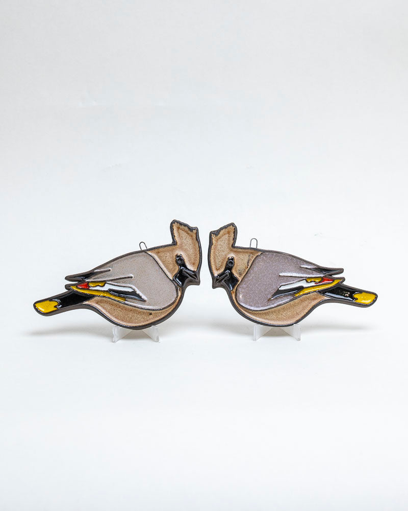 Ceramiczna dekoracja ścienna przedstawiająca jemiołuszkę, szkliwiona w odcieniach szaro-beżowych z charakterystycznymi żółtymi i czerwonymi akcentami na skrzydłach. Dostępna w dwóch wersjach: patrzącą w lewo oraz patrzącą w prawo. Wyposażona w uchwyt do zawieszenia. Stanowi elegancką, naturalną ozdobę, która pasuje do różnych wnętrz.