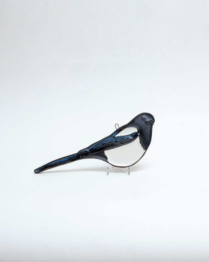 Ceramiczna dekoracja ścienna przedstawiająca srokę, szkliwiona w odcieniach czerni, bieli i granatu. Wyposażona w uchwyt do zawieszenia. To wyrazista, pojedyncza ozdoba, która dobrze pasuje do nowoczesnych i minimalistycznych wnętrz.