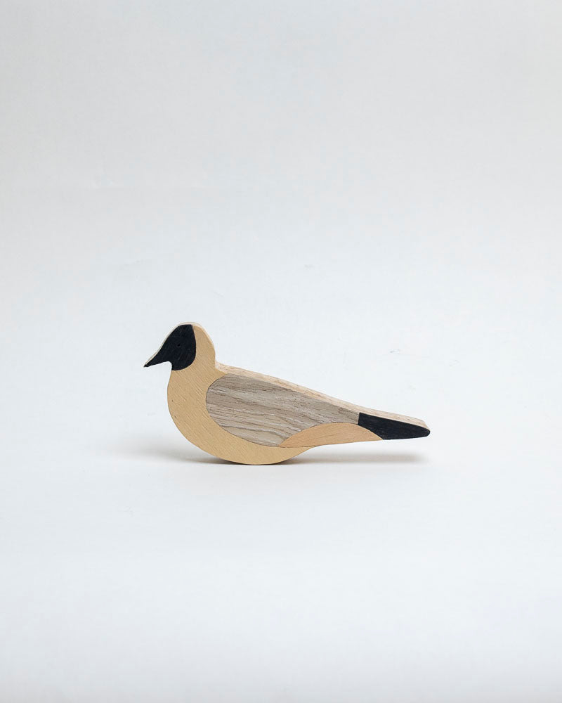 Lekka dekoracja ścienna przedstawiająca mewę, wykończona fornirem w jasnych, naturalnych odcieniach z czarnymi akcentami. Płaska forma sprawia, że dobrze prezentuje się na ścianie jako prosta, minimalistyczna ozdoba, pasująca do wnętrz skandynawskich i nadmorskich.