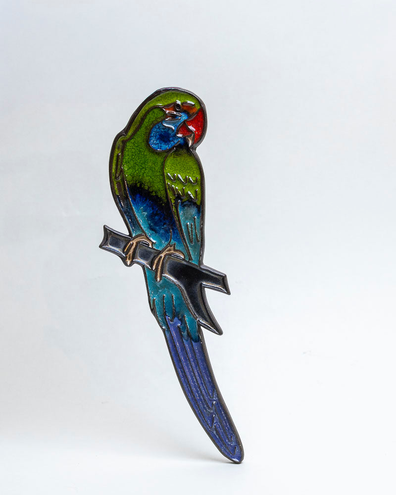 Ceramiczna dekoracja ścienna przedstawiająca papugę, szkliwiona w intensywnych odcieniach zieleni, niebieskiego, czerwieni i czerni. Osadzona na gałęzi, wyposażona w uchwyt do zawieszenia. To barwna i efektowna ozdoba, idealna do wnętrz potrzebujących żywego, egzotycznego akcentu.