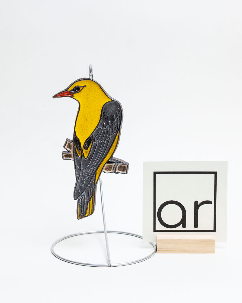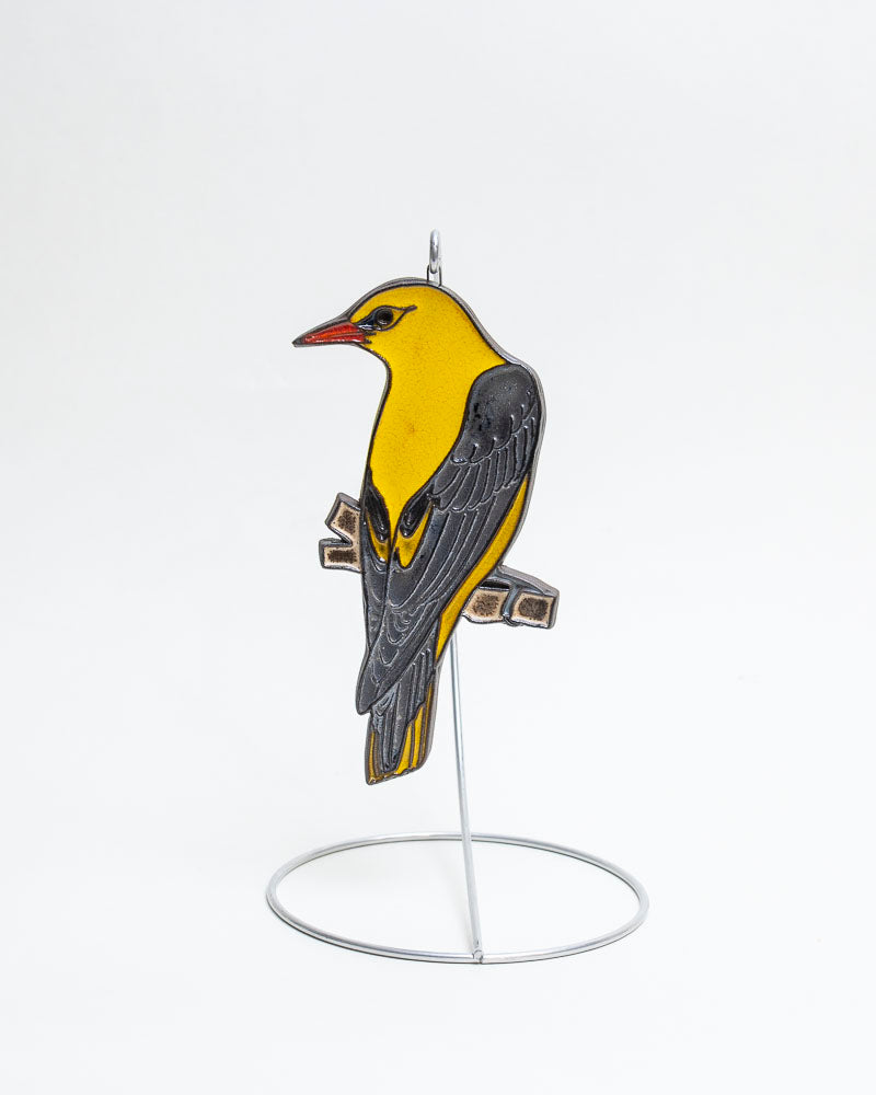 Ceramiczna dekoracja ścienna przedstawiająca wilgę, szkliwiona w intensywnym żółtym kolorze z czarnymi akcentami na skrzydłach. Umieszczona na niewielkiej gałązce, wyposażona w uchwyt do zawieszenia. To wyrazista i elegancka ozdoba, która świetnie ożywia wnętrze.