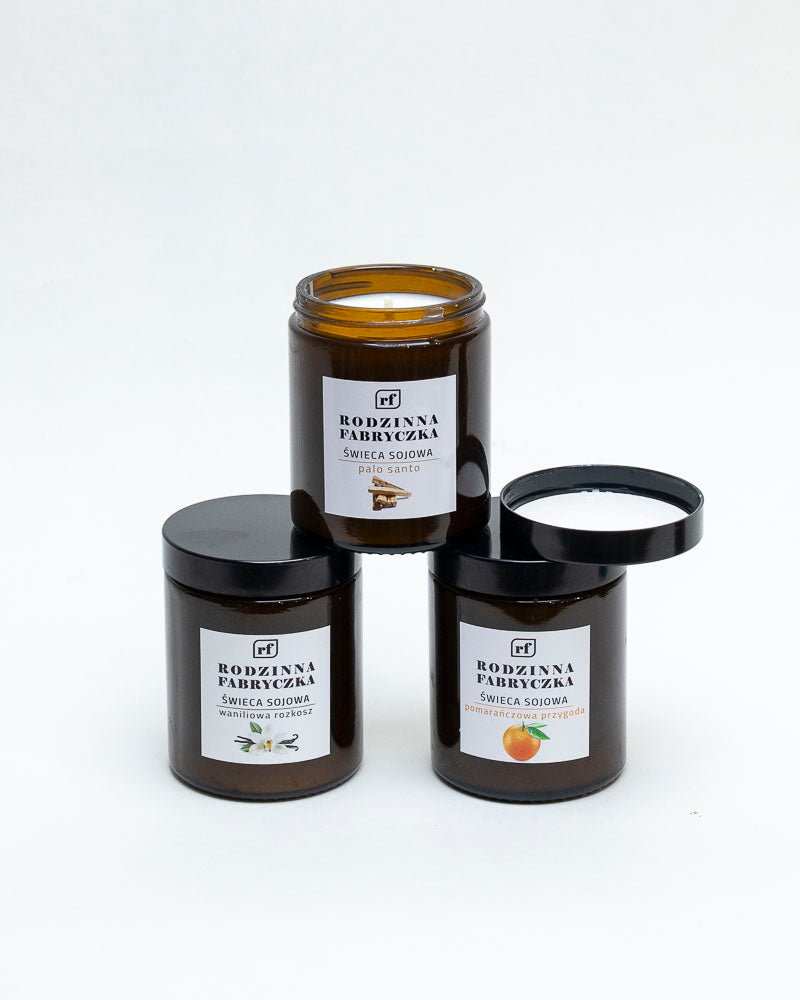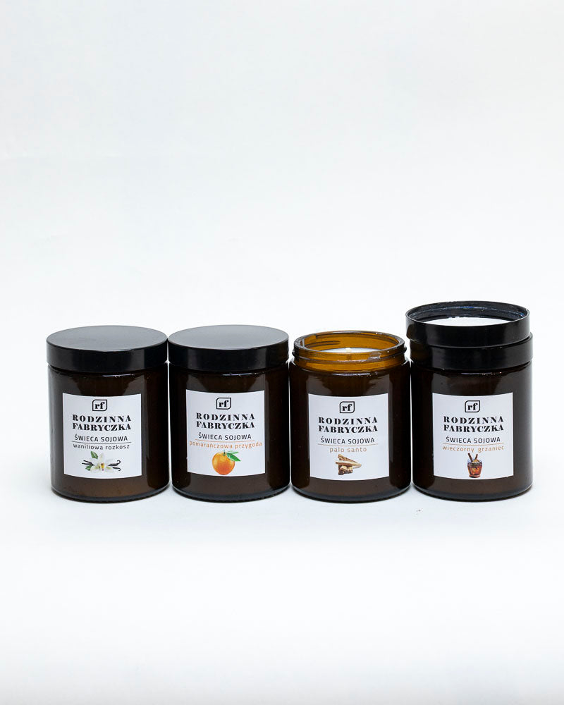 Naturalna świeca zapachowa wykonana z ekologicznego wosku sojowego, zamknięta w eleganckim brązowym słoiku z czarną nakrętką. Dostępna w różnych wariantach zapachowych. Spala się czysto i równomiernie, tworząc przyjemną atmosferę w domu lub biurze. Idealna na prezent lub do codziennego użytku.