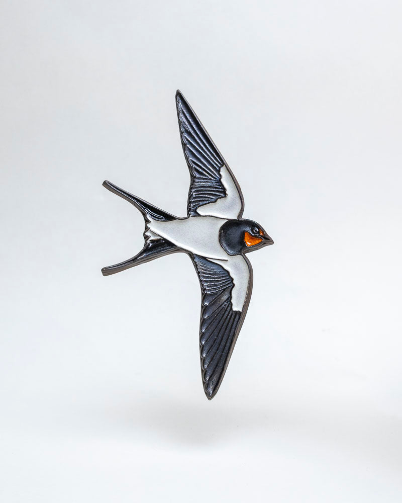 Ceramiczna dekoracja ścienna przedstawiająca jaskółkę w locie, szkliwiona w odcieniach czerni, bieli i z pomarańczowym akcentem przy głowie. Wyposażona w uchwyt do zawieszenia. Lekka i dynamiczna ozdoba, która dodaje wnętrzu świeżości i subtelnego, naturalnego charakteru.
