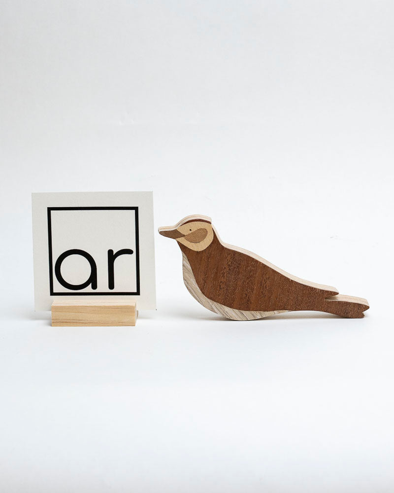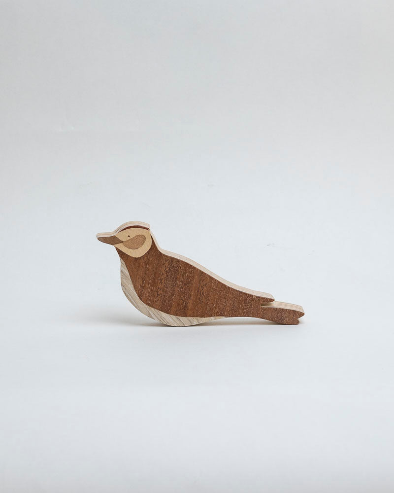 Dekoracja ścienna przedstawiająca skowronka, wykończona fornirem w naturalnych odcieniach brązu i beżu. Lekka i płaska, łatwa do powieszenia na ścianie. Sprawdzi się jako prosta ozdoba w salonie, sypialni lub pokoju dziecięcym, wprowadzając delikatny, naturalny akcent.