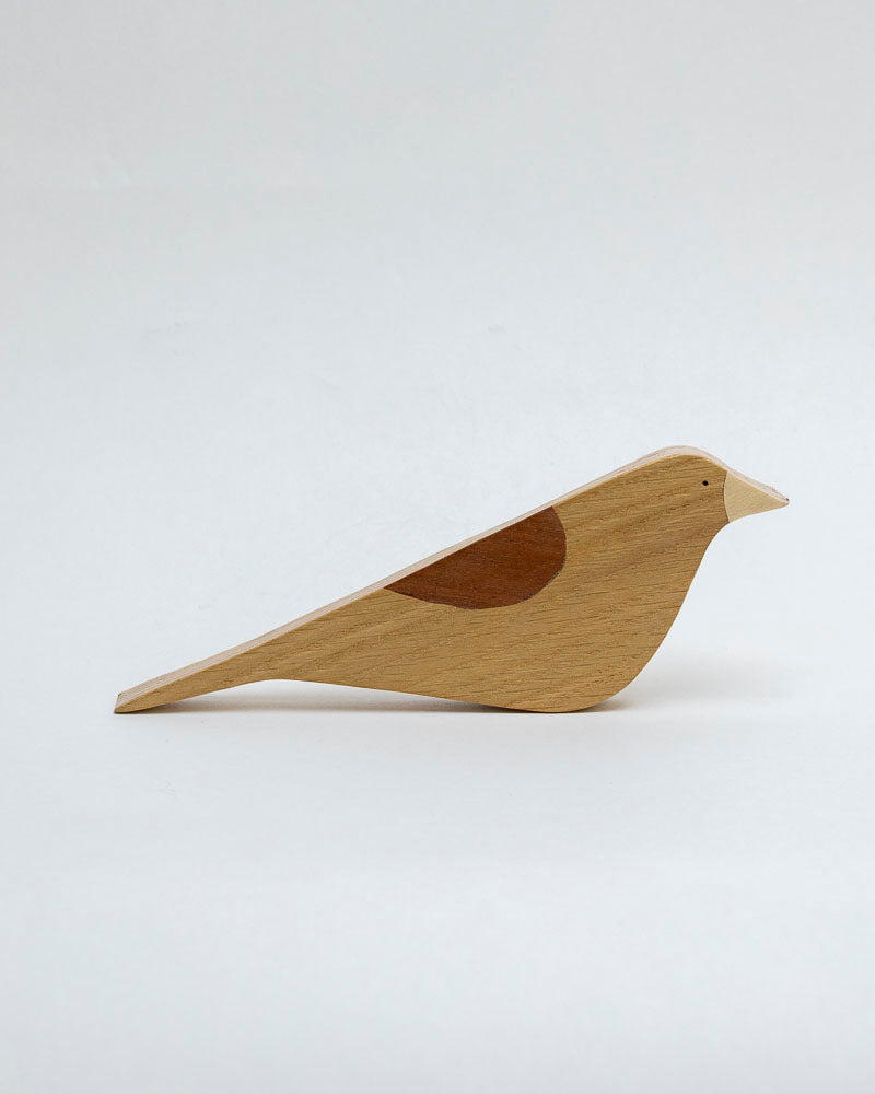 Prosta dekoracja ścienna przedstawiająca wilgę, wykończona fornirem w jasnych odcieniach z ciemniejszym akcentem na skrzydle. Lekka, płaska i łatwa do zawieszenia, stanowi subtelną ozdobę w naturalnym stylu. Pasuje do salonu, kuchni lub pokoju dziecięcego.