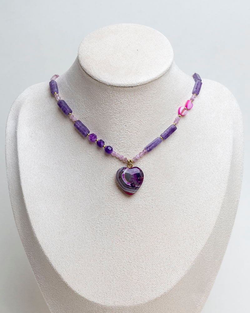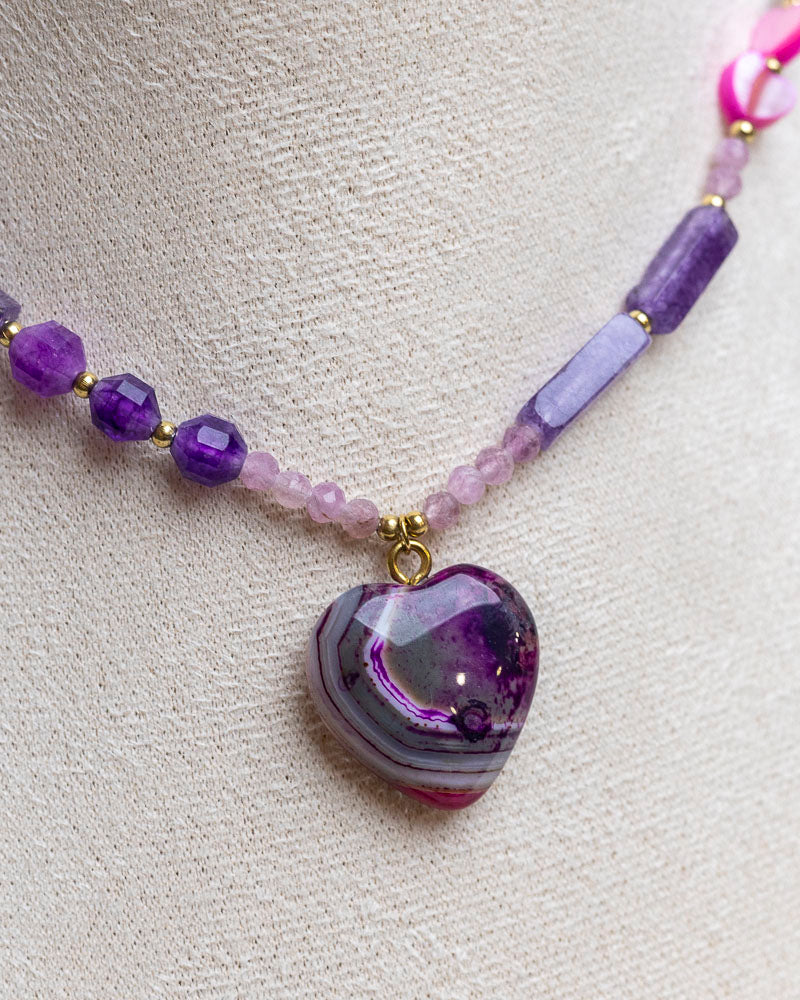 Delikatna kompozycja w odcieniach fioletu, w której chłodna głębia ametystu spotyka się z malowniczym rysunkiem agatu w kształcie serca. Naszyjnik emanuje spokojem, odrobiną tajemniczości i subtelną elegancją – jak zachód słońca przelewający się przez szklane tafle.