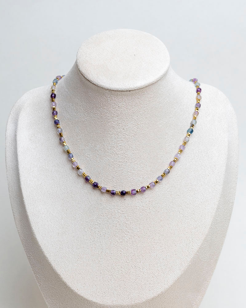 Ten delikatny naszyjnik z fluorytu mieni się subtelną paletą fioletów, błękitów i mglistych zieleni – jak poranny ogród skąpany w chłodnym świetle. Każdy kamień jest tu małą kroplą koloru, przejrzystą, wielowarstwową, pełną naturalnego światła. Całość układa się w lekką, harmonijną linię, która pięknie otula szyję, dodając stylizacjom miękkiej elegancji.