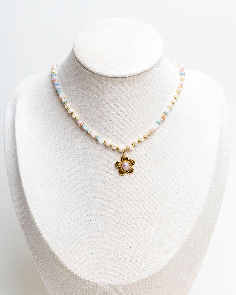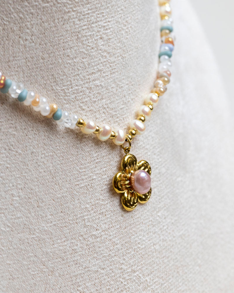 Ten delikatny naszyjnik łączy w sobie subtelny blask pereł z pastelową lekkością szklanych koralików, tworząc kompozycję jak pierwsze światło dnia odbite na wodzie. Centralny, kwiatowy wisiorek z perłą dodaje całości romantycznego akcentu, a miękkie przejścia kolorów w koralikach sprawiają, że naszyjnik mieni się przy każdym ruchu.