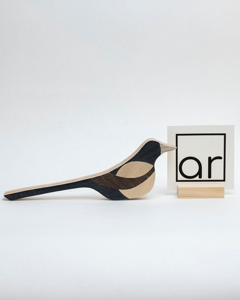 Dekoracja ścienna przedstawiająca srokę, wykończona fornirem w odcieniach czerni, beżu i brązu. Płaska i lekka, przeznaczona do zawieszenia na ścianie. Stanowi prostą, nowoczesną ozdobę, która dobrze wpisuje się w naturalne i minimalistyczne wnętrza.