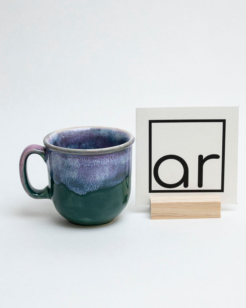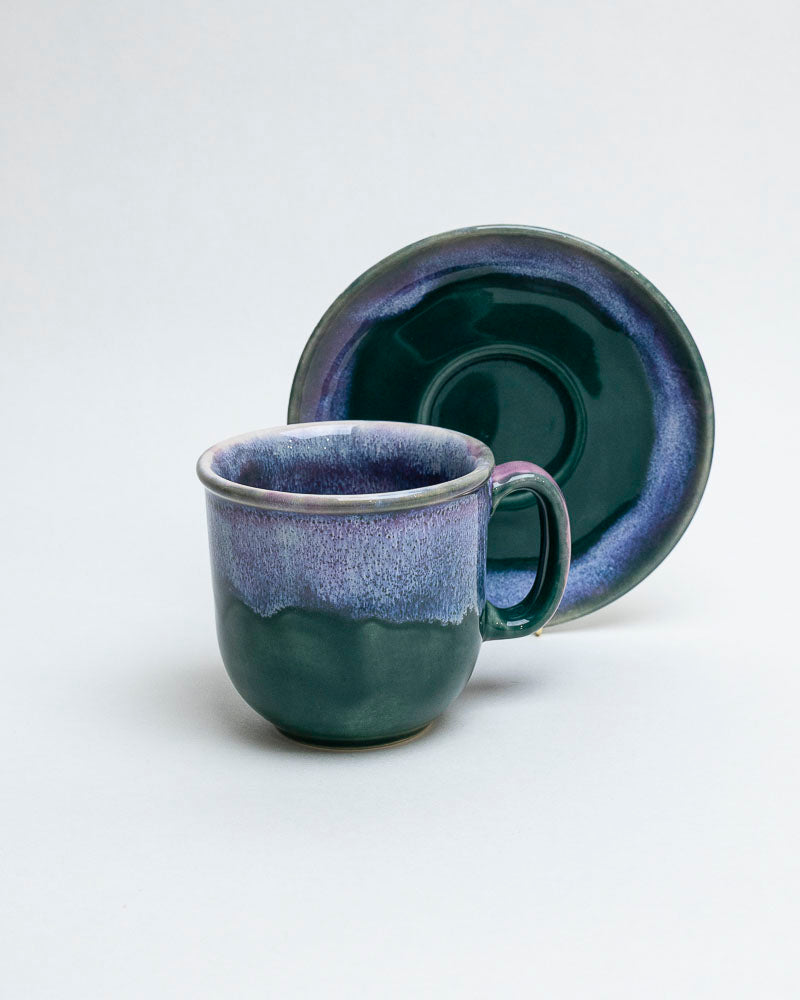 Jak tafla wody tuż po zachodzie słońca – ciemnozielona głębia spotyka się tu z chłodnym fioletem zmierzchu. Subtelne przejścia barw przywodzą na myśl spokojną taflę jeziora, na której wciąż odbija się ostatnie światło dnia. Filiżanka, która wprowadza ciszę i skupienie w każdy poranek.