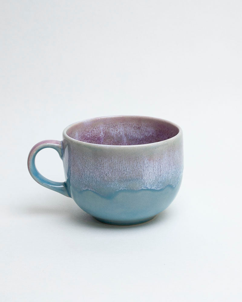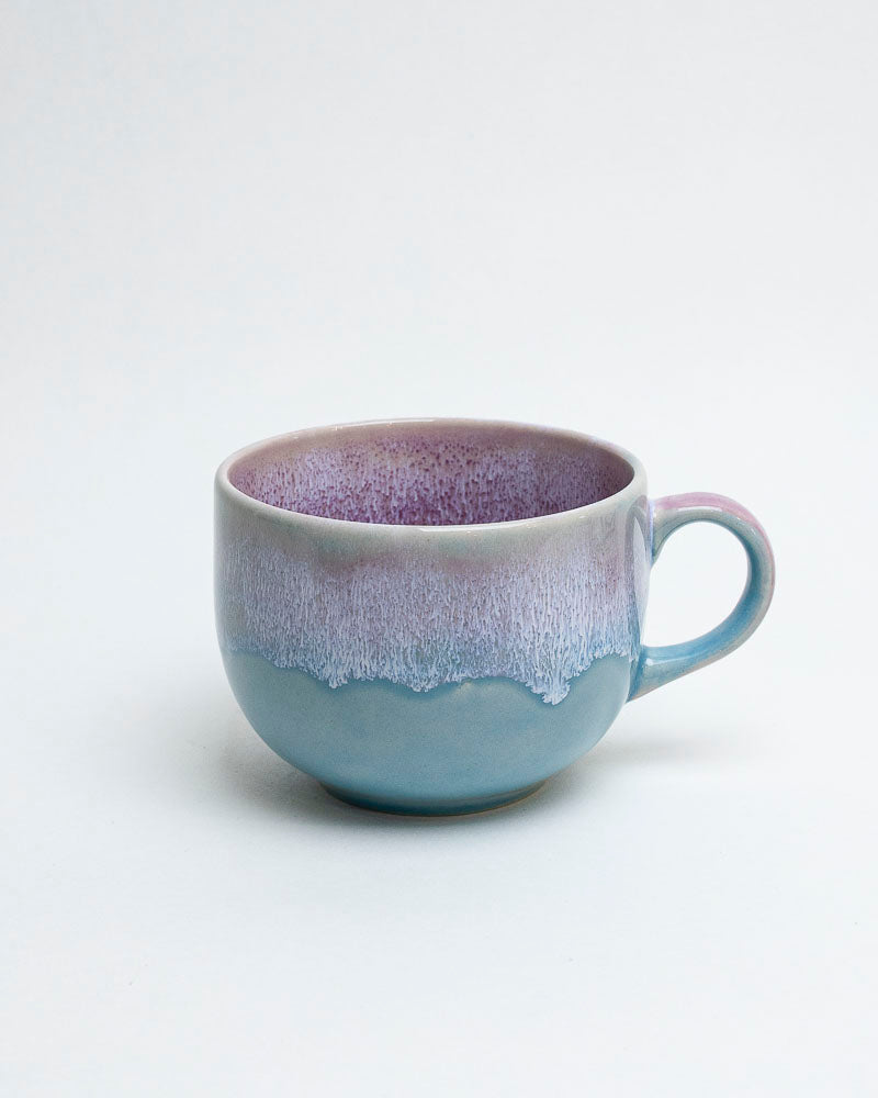 Ten kubek to spokojny oddech pośród pastelowych chmur – błękit jeziora spotyka się tu z delikatnym fioletem lawendy, a miękkie przejścia szkliwa przypominają horyzont o świcie. Wnętrze połyskuje subtelnym fiołkowym odcieniem, jakby zapraszało do powolnego celebrowania każdej chwili.