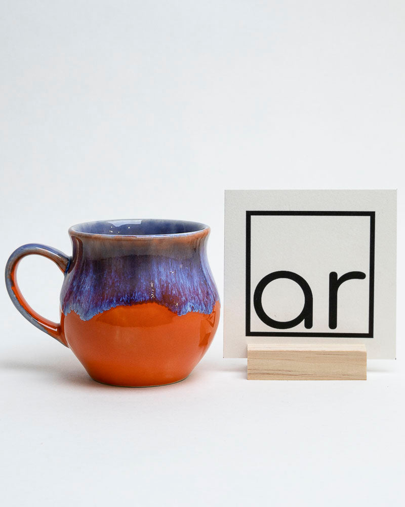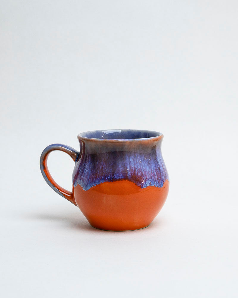 Jak letni wieczór, gdy słońce tonie w pomarańczach, a niebo zaczyna chłonąć fiolety nocy. Głęboki odcień ciepłej gliny spotyka się z chłodnym, lśniącym fioletem, który spływa miękko ku dołowi, jak ostatnie światło dnia po tafli jeziora. Kształt kubka pełen łagodnych krzywizn — stworzony, by idealnie leżeć w dłoniach.