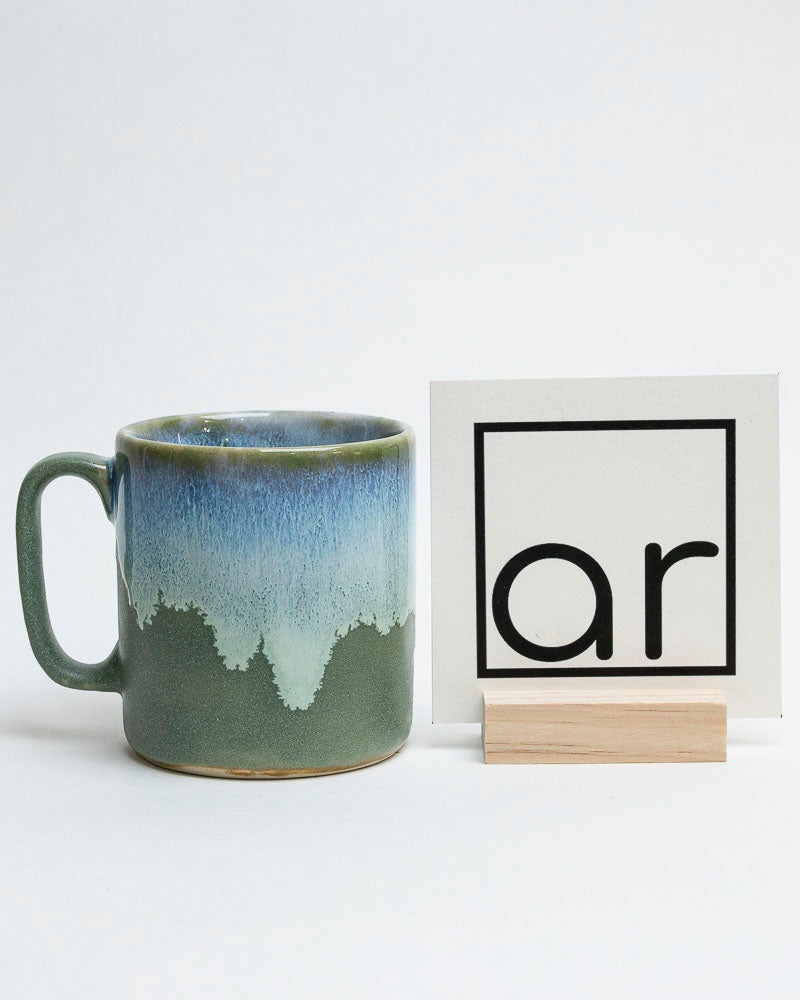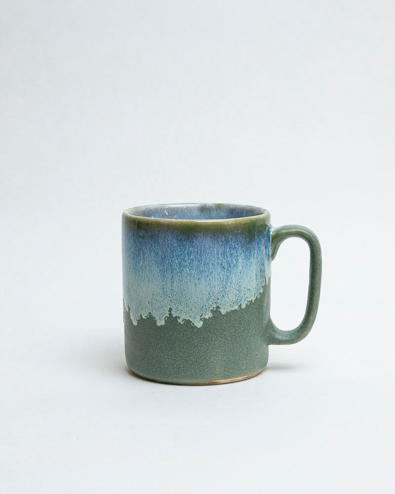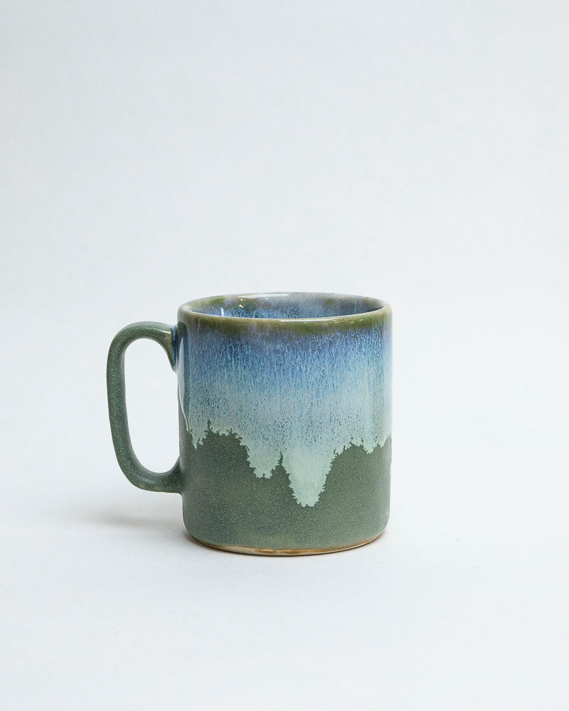 Jak spokojna tafla wody tuż przed wschodem słońca — chłodny błękit spotyka się z matową zielenią, tworząc pejzaż ciszy i światła. Gładka forma kubka o prostych liniach przywodzi na myśl spokój poranka, a szkliwo układa się jak horyzont, gdzie zieleń lasu styka się z niebem.