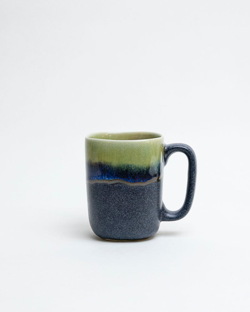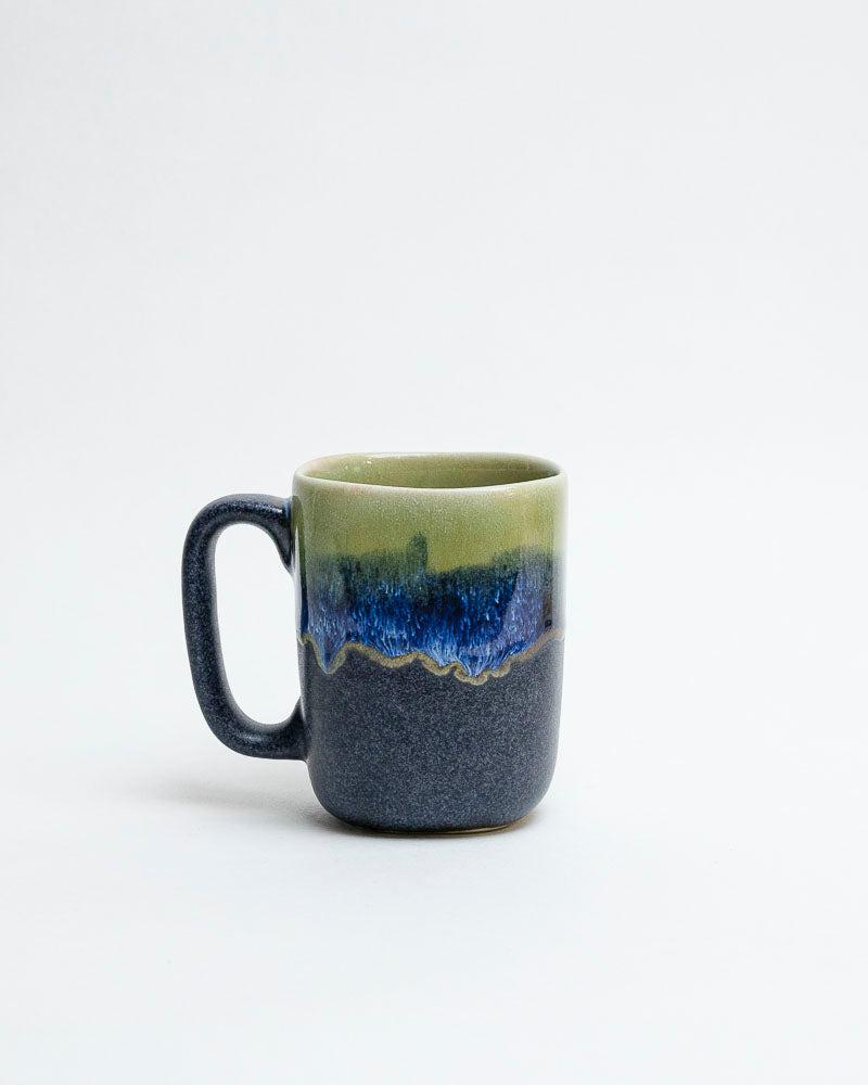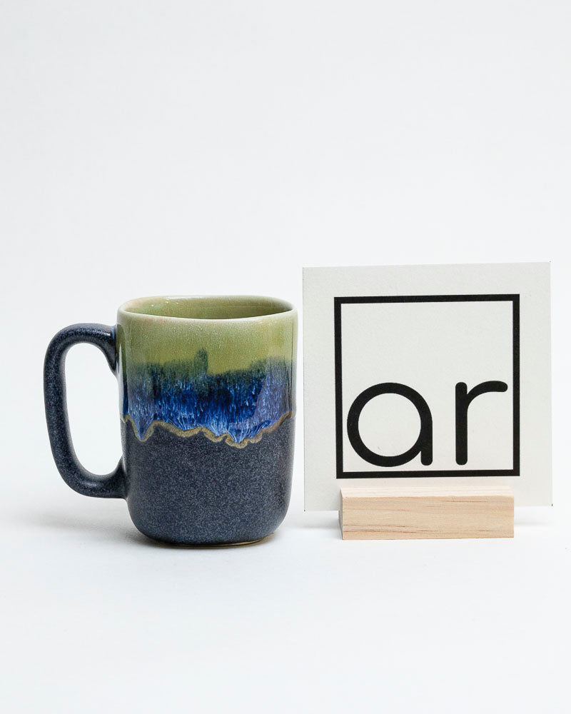 Jak poranna rosa na kamieniu — chłodny, szlachetny i spokojny. Górna część kubka tonie w odcieniach zielonego mchu, które miękko przechodzą w głęboki granat i ciemny grafit. Szkliwo spływa powoli, tworząc naturalne przejścia barw przypominające górski pejzaż po deszczu. Prosty kształt kubka z klasycznym uchem podkreśla jego użytkową elegancję.