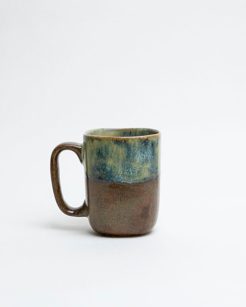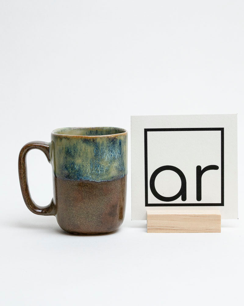 Jak spacer po lesie po letnim deszczu — wilgotna ziemia, zapach mchu i kamieni ogrzanych słońcem. Górna część kubka mieniąca się zielenią i błękitem przypomina omszałe głazy nad strumieniem, a dolna — głęboki brąz kamienia. Prosty, nowoczesny kształt z wygodnym uchem czyni go idealnym towarzyszem codziennych rytuałów.