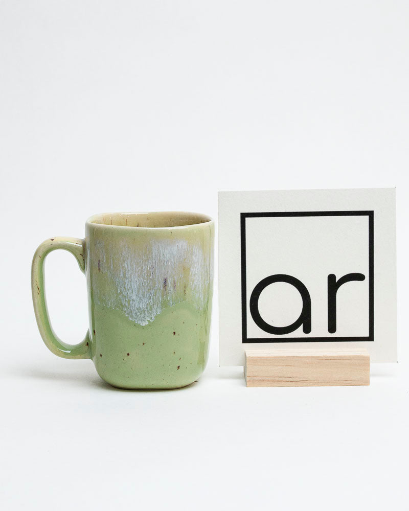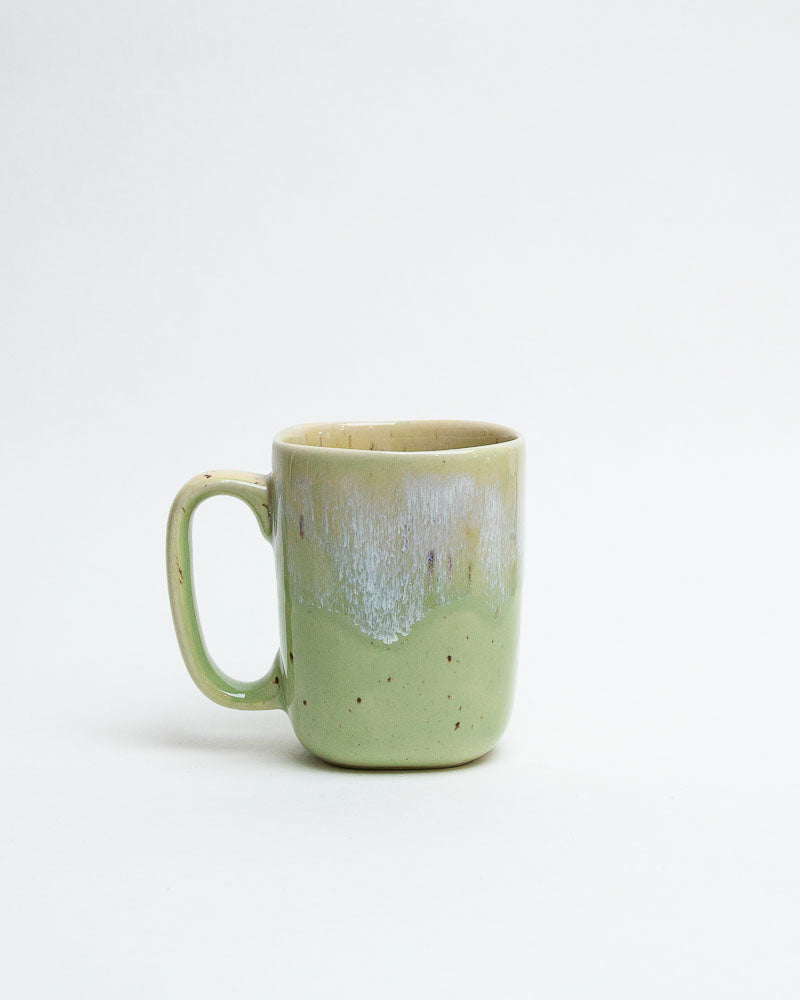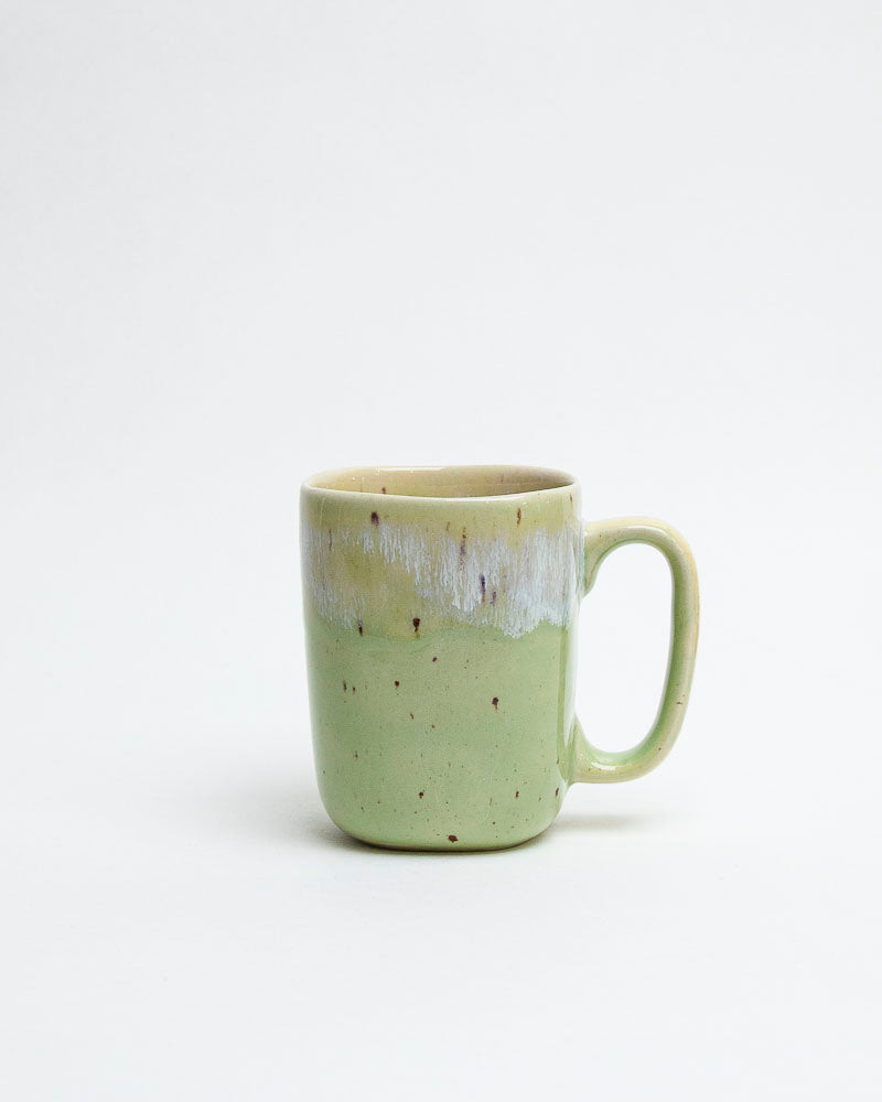 Jak pierwsze promienie słońca muskające liście — lekki, świeży i pełen ciepła. Kubek w odcieniach pistacjowej zieleni, przełamany delikatnym, kremowo-białym szkliwem spływającym z góry niczym mleczna mgła. Drobne piegi na powierzchni dodają mu naturalnego uroku i rzemieślniczego charakteru.