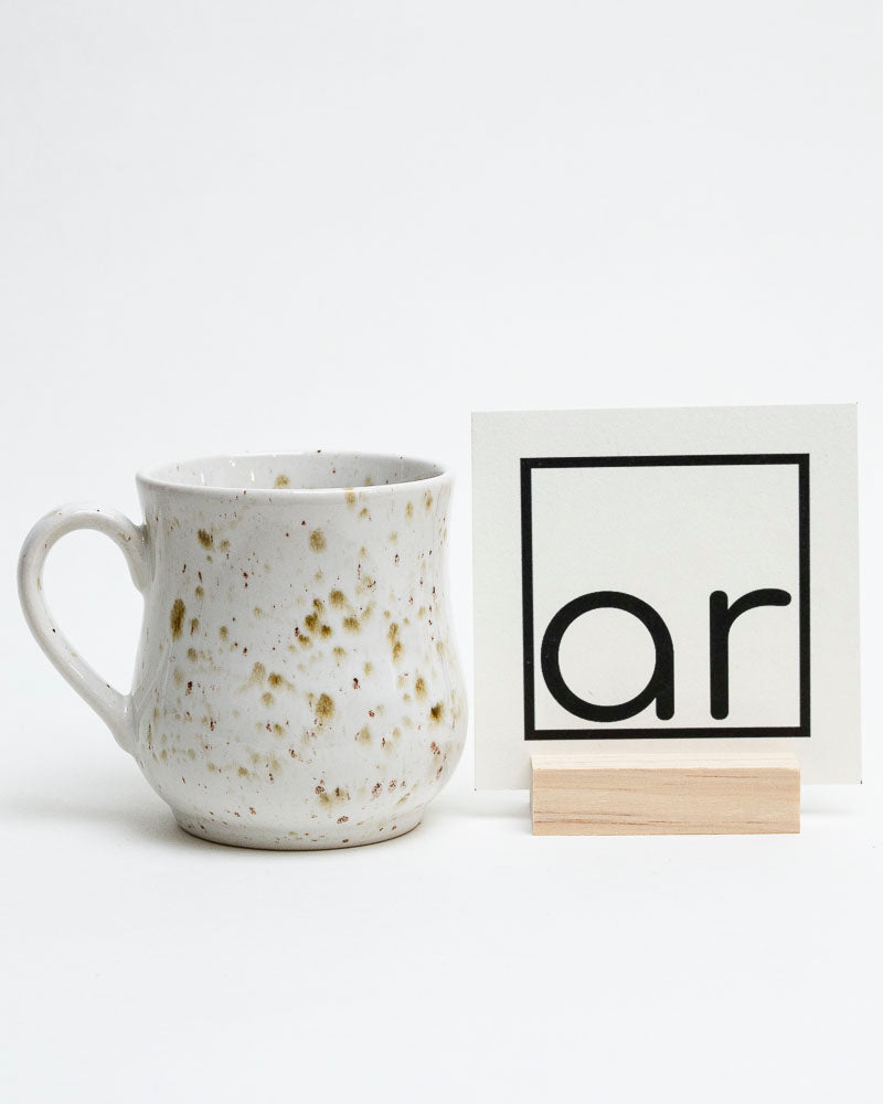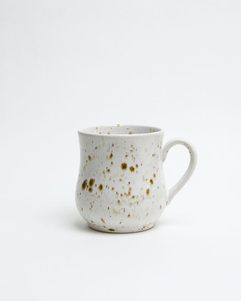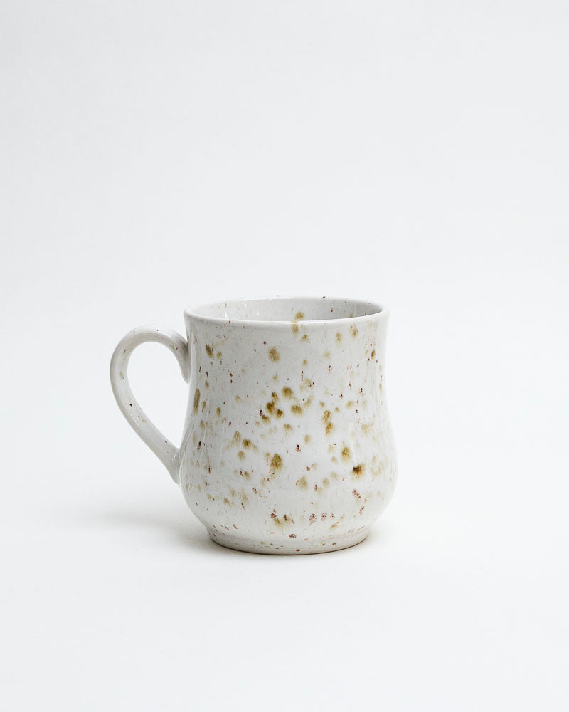 Jak poranna rosa na kamieniu – subtelny, naturalny i spokojny. Kremowa powierzchnia kubka ozdobiona jest nieregularnymi, oliwkowo-zielonymi piegami, które przywodzą na myśl mech rosnący w cieniu drzew. Organiczna forma z łagodnym przewężeniem sprawia, że kubek doskonale mieści się w dłoniach i zaprasza do cichej chwili wytchnienia.