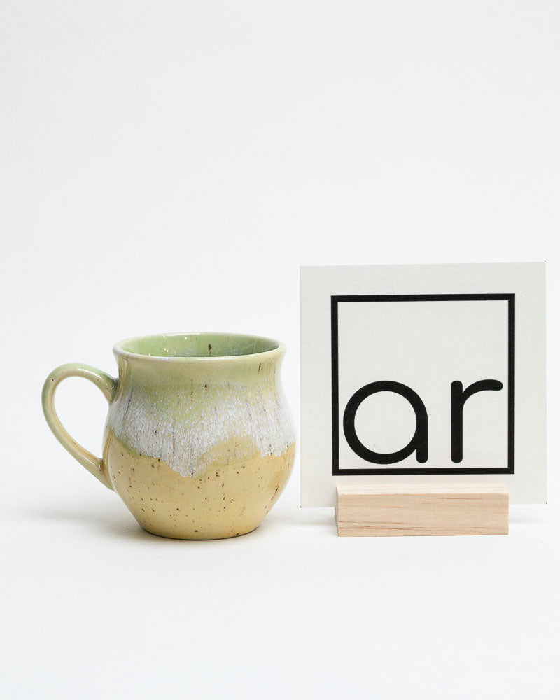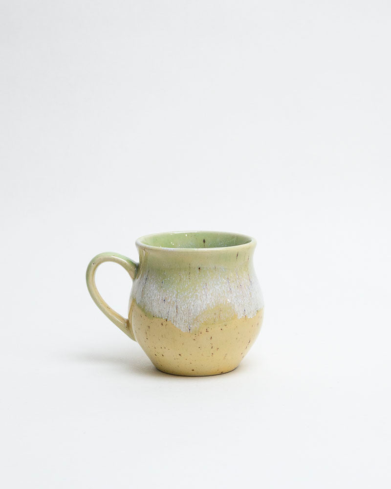 Jak pierwsze światło dnia na młodej trawie — delikatny, świeży i pełen spokoju. Miękka linia formy łączy się tu z ciepłą kolorystyką: u dołu miodowa żółć, wyżej pistacjowa zieleń, a na krawędzi subtelna, mleczna poświata szkliwa. Kubek emanuje harmonią i naturalnym wdziękiem, idealny na spokojny początek dnia.