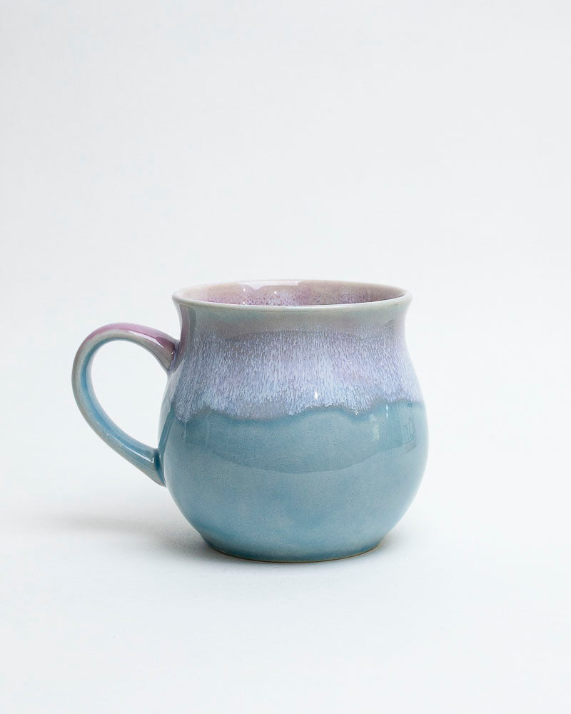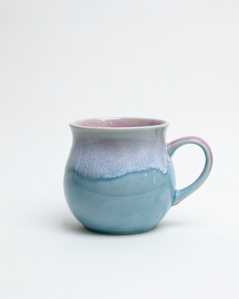 Jak spokojne niebo o świcie — delikatny błękit przechodzi tu w jasny fiolet i perłowe refleksy, tworząc powierzchnię o miękkim, świetlistym charakterze. Subtelne przejścia barw przypominają światło rozlewające się po wodzie, a zaokrąglona forma kubka otula dłonie ciepłem porannego naparu.