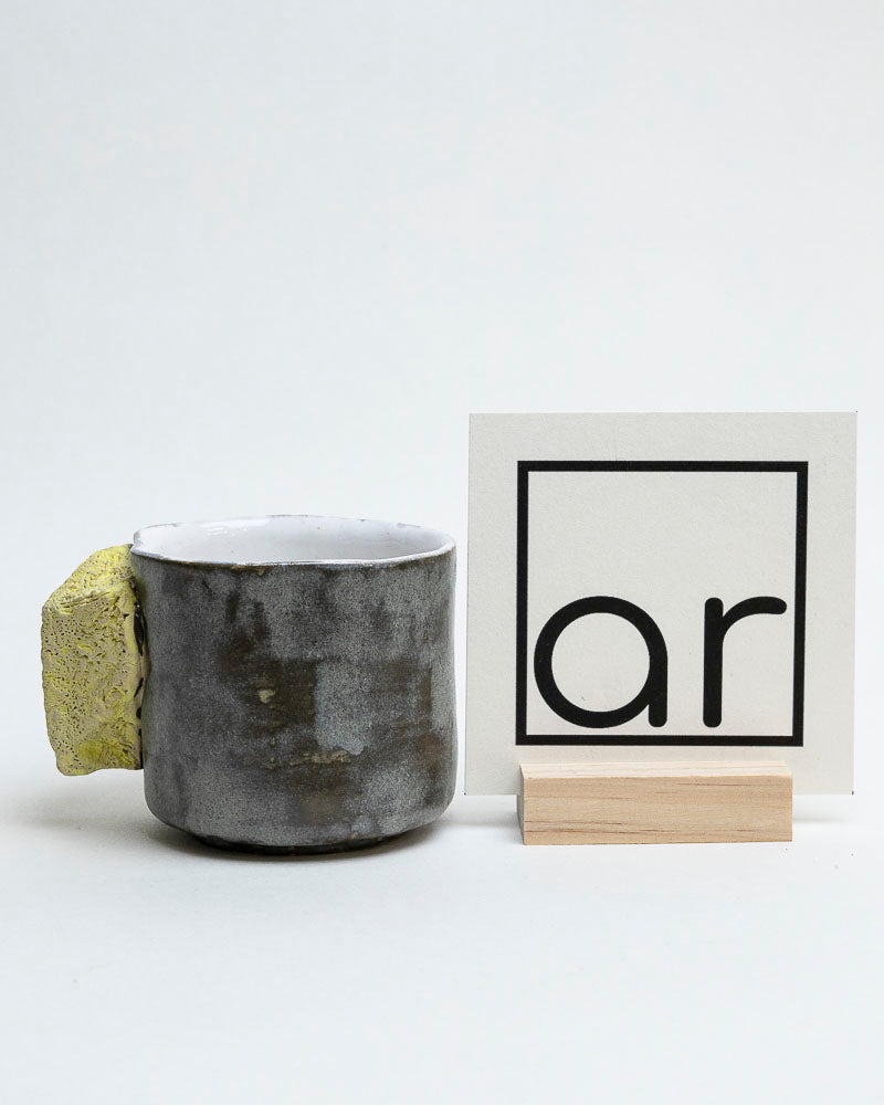Jak kawałek górskiego zbocza zamieniony w ceramikę. Surowy, ciemnoszary korpus przywołuje wulkaniczny bazalt, a uchwyt w kolorze żółtego porostu wygląda, jakby rósł na jego powierzchni od setek dni spędzonych na słońcu i wietrze. To kubek dla tych, którzy widzą piękno w fakturze skały i dotyku magnezji.