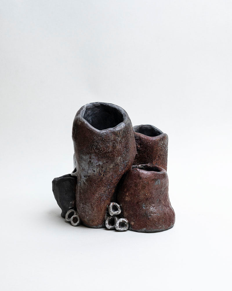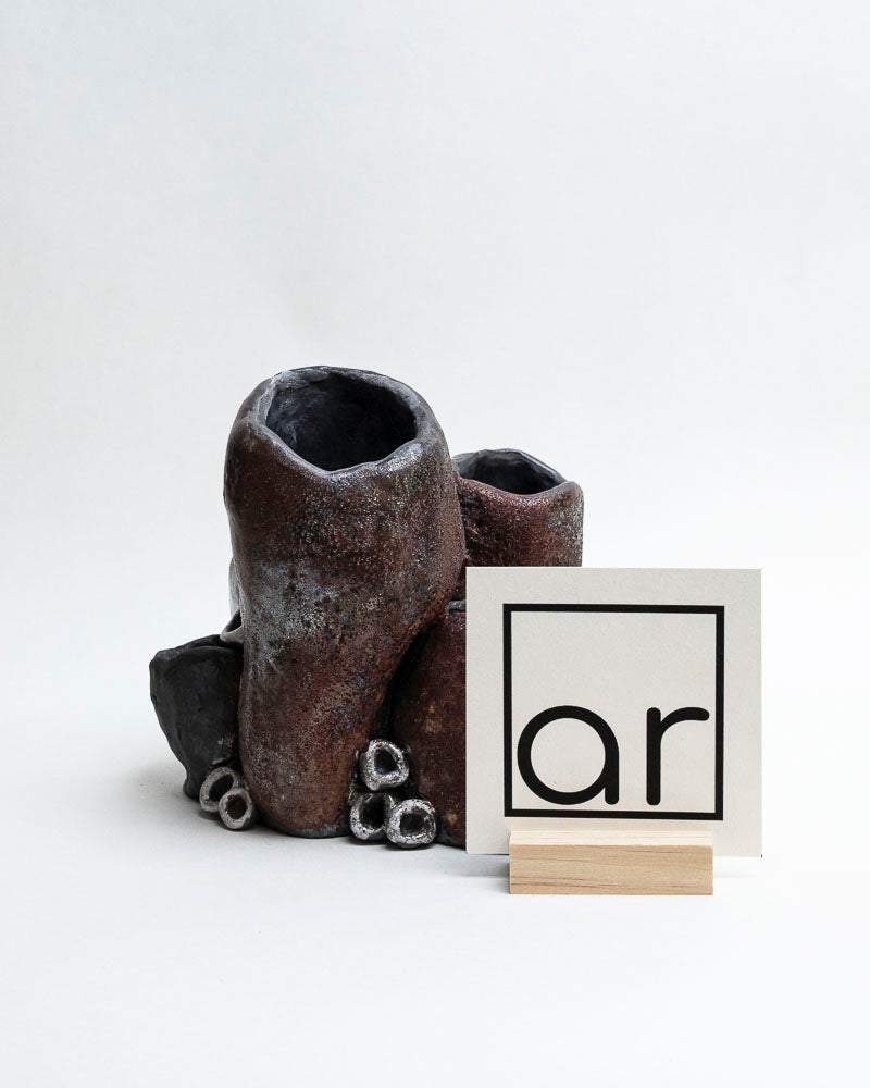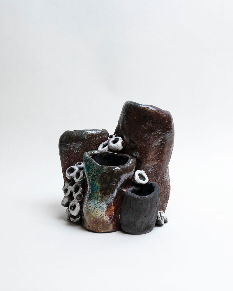 Jak fragment zatopionej skały wynurzony z oceanu — surowy, niepokorny, z błyskiem tajemniczego życia. Ręcznie lepiony z gliny i wypalony techniką raku, która nadała mu niepowtarzalne przebarwienia — od ciemnego brązu i grafitu po turkusy, zielenie i miedź. Białe, organiczne formy przypominają muszle lub koralowce, jakby wciąż tętniły podwodnym echem.