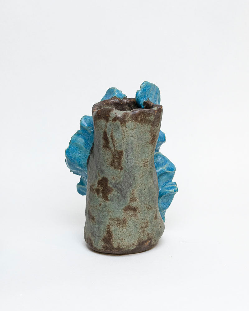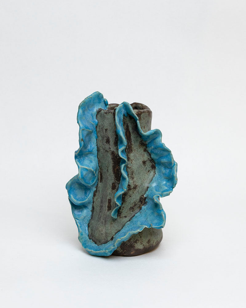 Jakby wyrzeźbiony przez wodę i wiatr – ten wazon to opowieść o ruchu, lekkości i sile natury. Organiczna forma z wijącymi się falami błękitu otula ciemne, matowe tło niczym morska piana skałę. Rzeźbiarska, niemal taneczna linia przyciąga wzrok i sprawia, że każdy kwiat nabiera w nim poetyckiego charakteru.