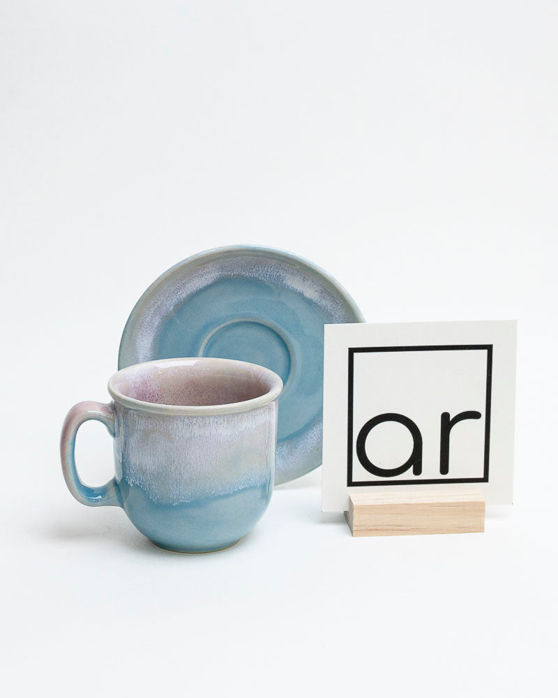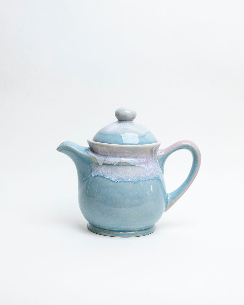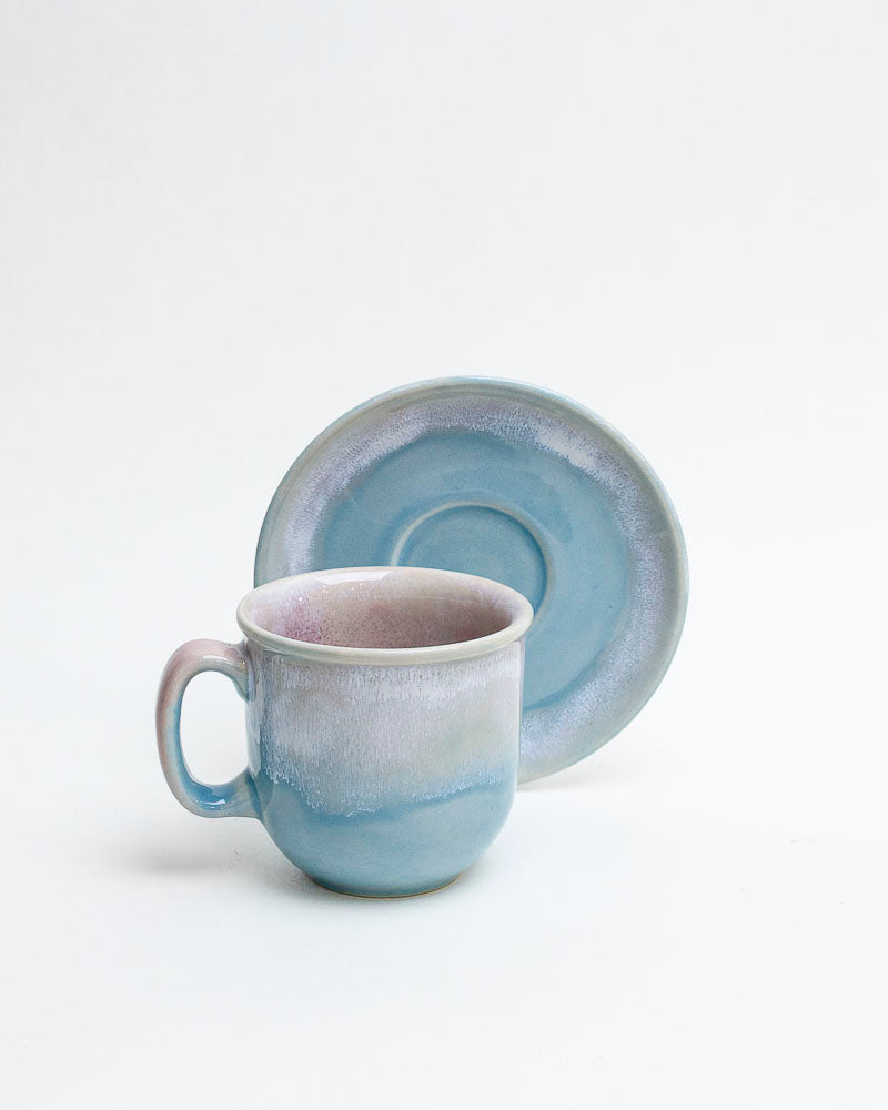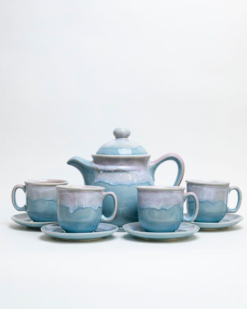 Delikatny jak świt nad jeziorem, w odcieniach błękitu, lawendy i perłowej poświaty. Zestaw, który przynosi spokój – idealny do leniwych poranków i popołudniowych rozmów przy herbacie. Subtelne szkliwa spływają miękko po krawędziach, tworząc spokojny pejzaż w odcieniach chmur i wody.